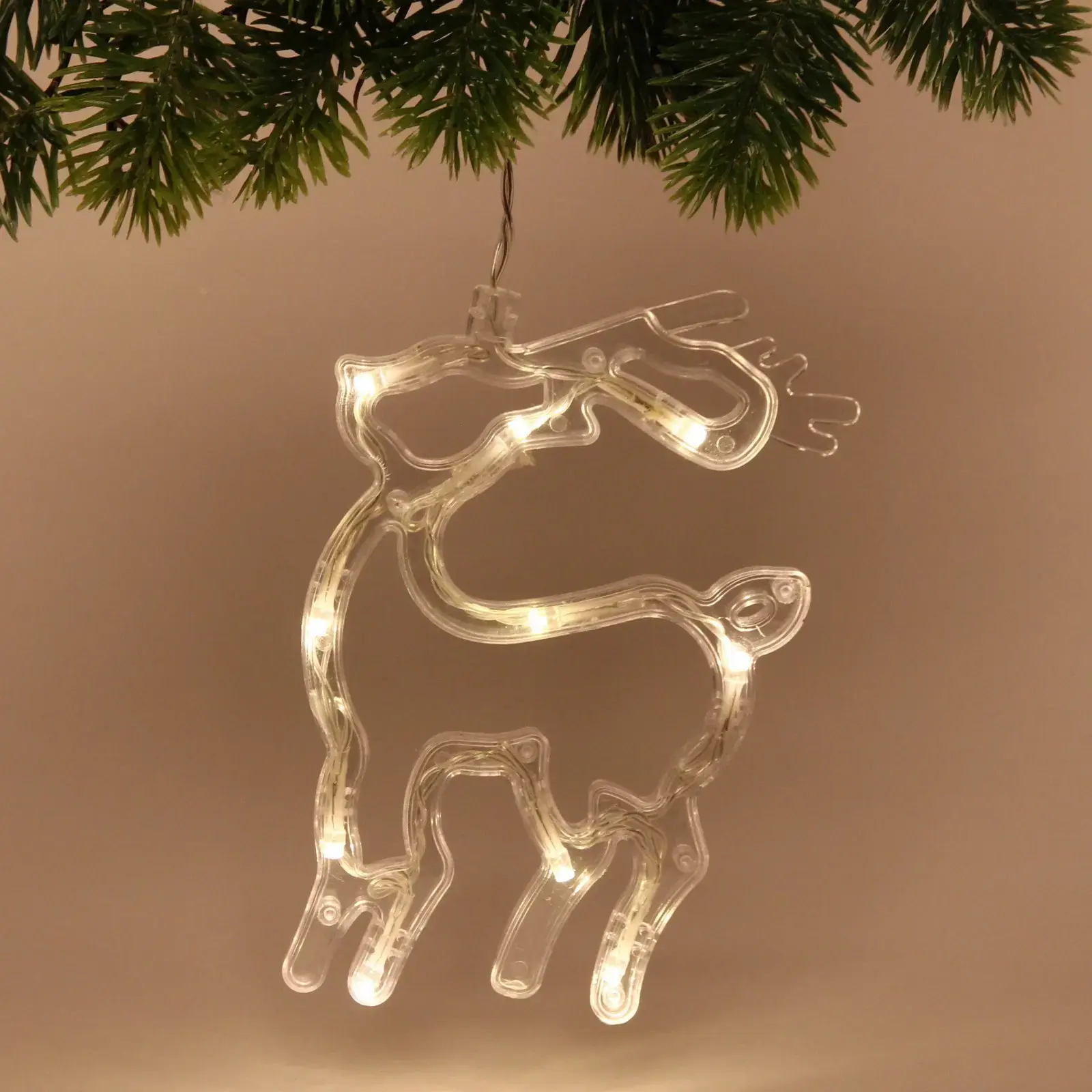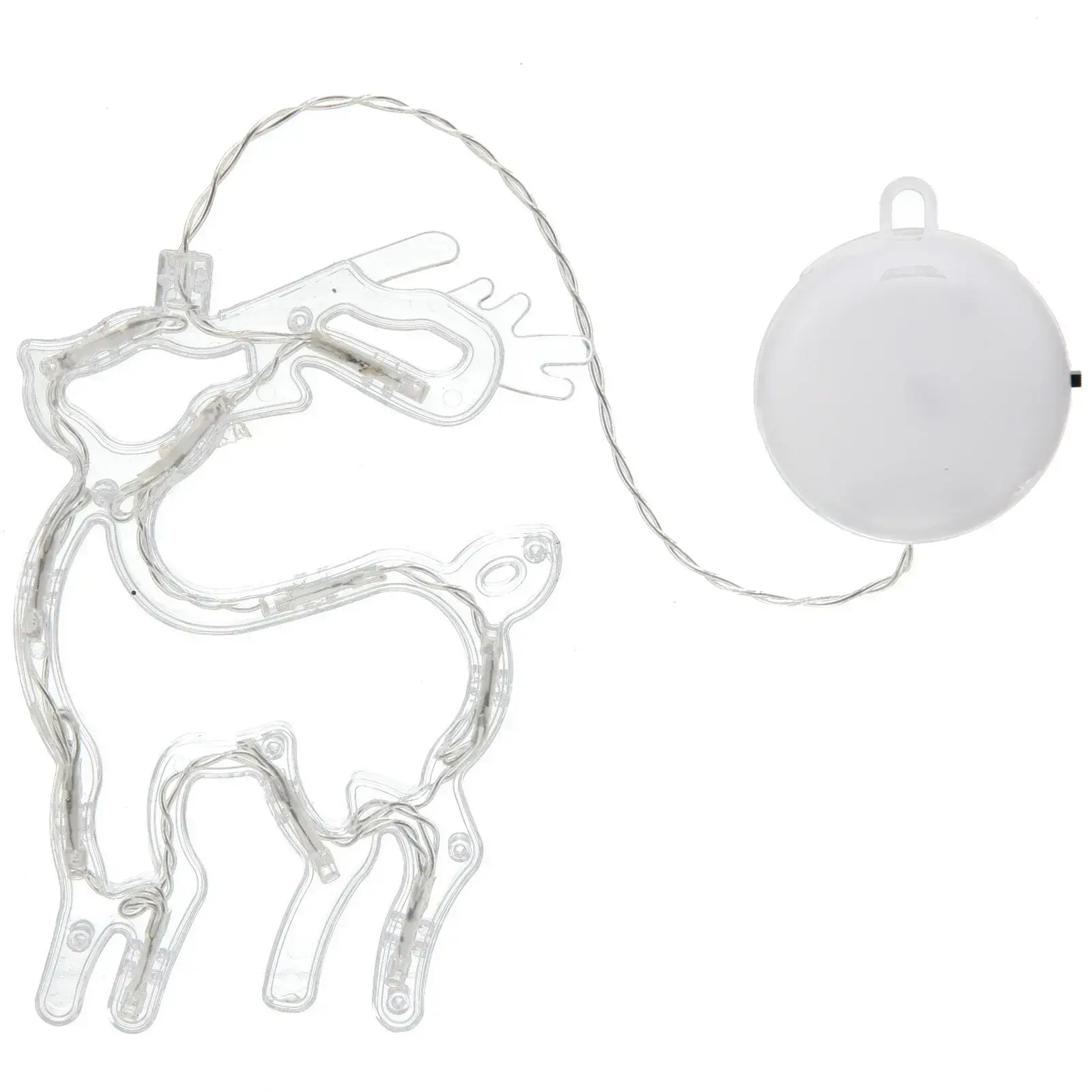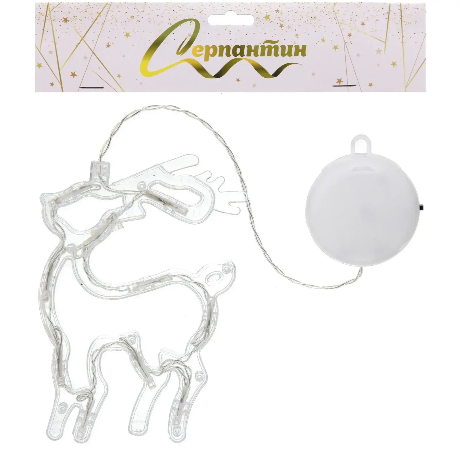 Светильник выполнен в форме оленя и изготовлен из прозрачного пластика, что позволяет свету красиво рассеиваться и создавать эффект свечения. Он отлично подходит для украшения новогодней ели, стола или любого другого места в вашем доме. Легкий и компактный, светильник можно легко подвесить или разместить на любой поверхности.