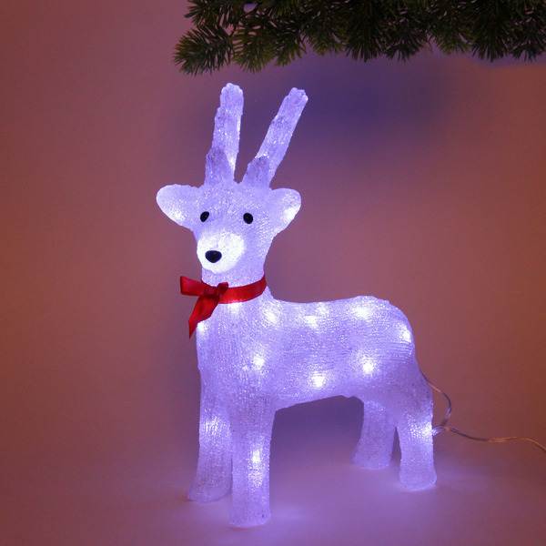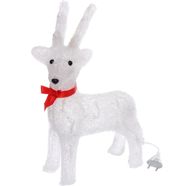 Фигура «Олененок» выполнена из прозрачного акрила и металла, что обеспечивает ей долговечность и устойчивость. Она оснащена 30 светодиодами, которые создают мягкое и приятное свечение. Подключение к сети 220V позволяет легко использовать фигурку в любом месте — на окне, в саду или на балконе. Олень имеет компактные размеры 24х17х37 см, что делает его удобным для размещения в любом уголке вашего дома.
