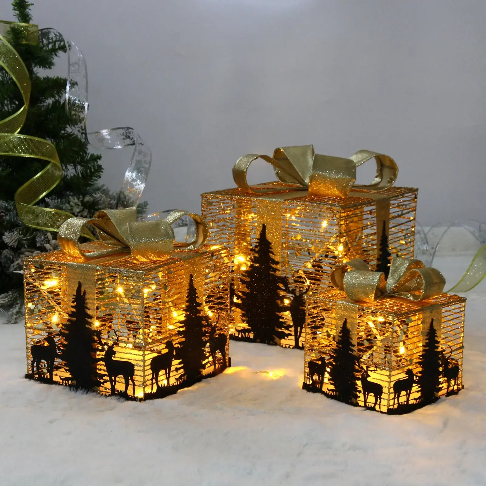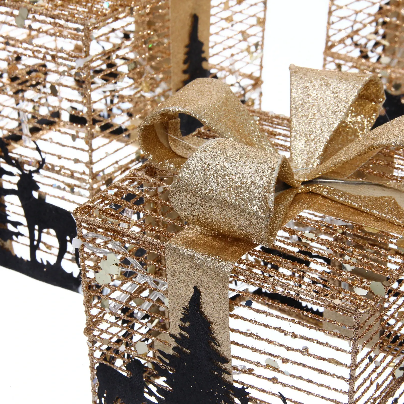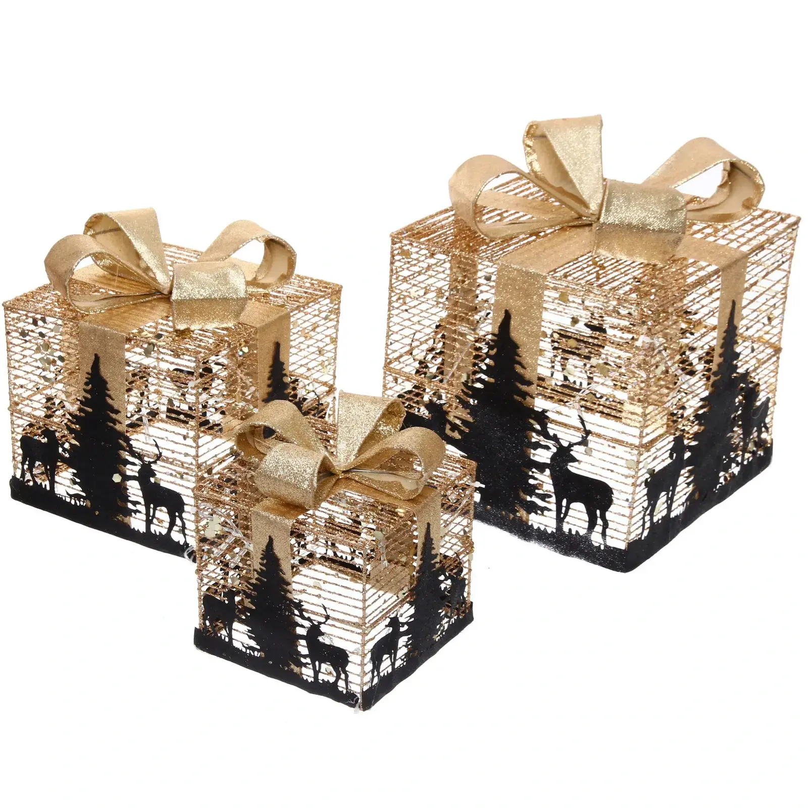 Металлические коробки с ажурным рисунком в виде оленей и елей дополнены элегантными бантиками. Световые эффекты создают мягкое рассеянное свечение, наполняя помещение теплом и уютом.