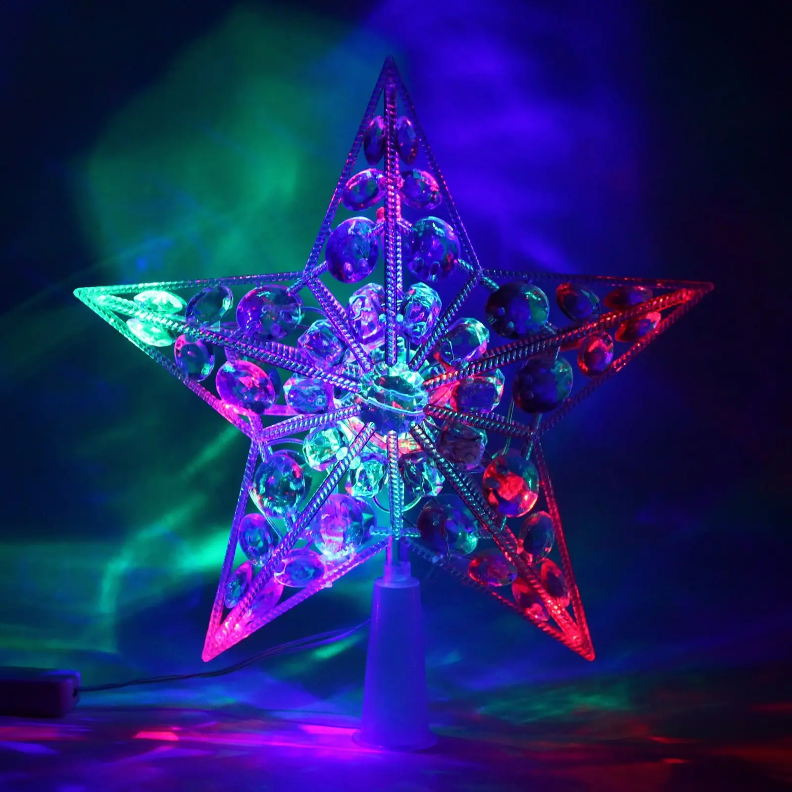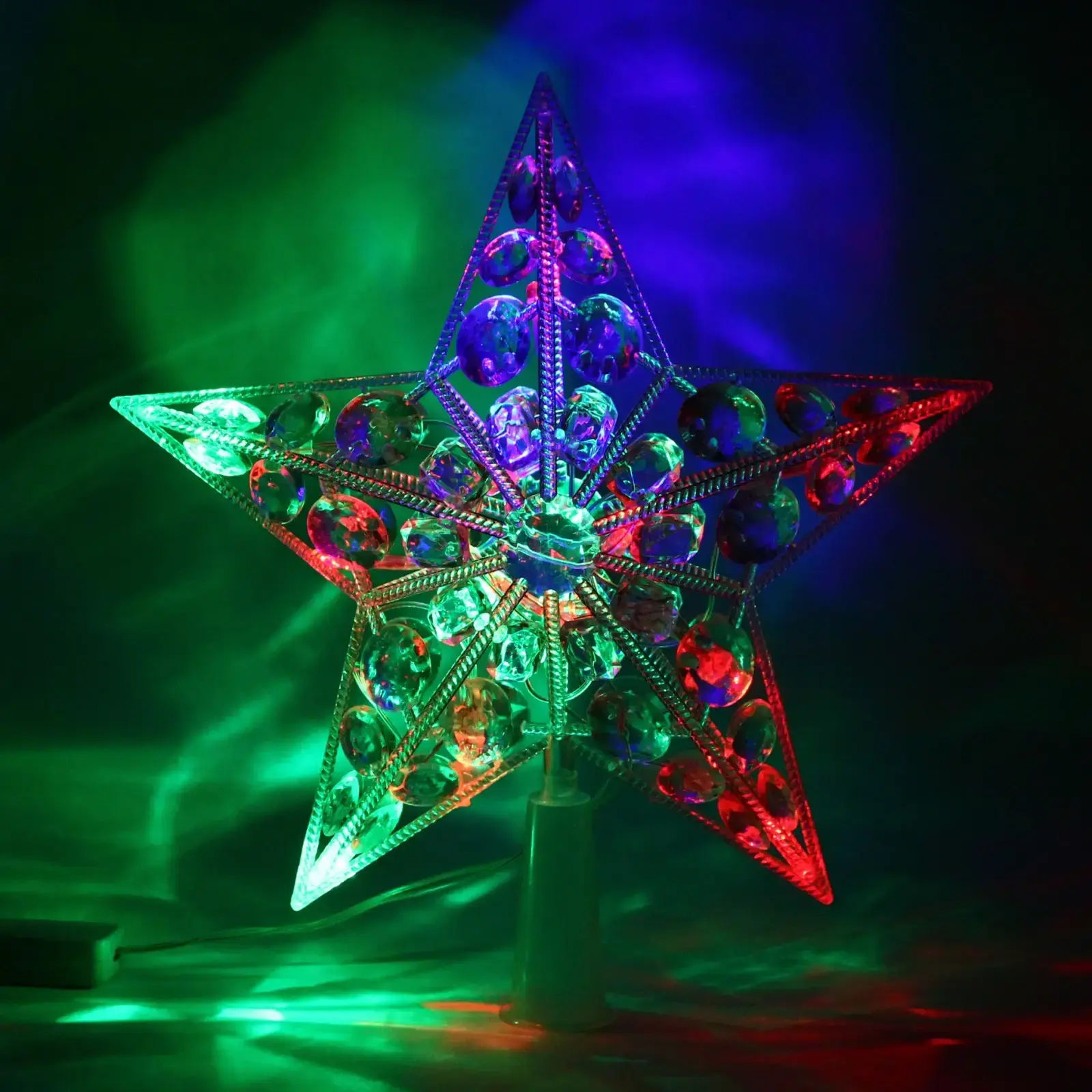 Почему стоит выбрать именно эту звезду? Во-первых, её яркие цвета — красный, зеленый и синий — создают эффектный световой проектор, который будет радовать вас и ваших близких. Во-вторых, звезда выполнена из качественных материалов: металл и пластик обеспечивают долговечность и надежность. В-третьих, её объемная форма и острые углы делают её не только красивой, но и стильной деталью вашего новогоднего декора.