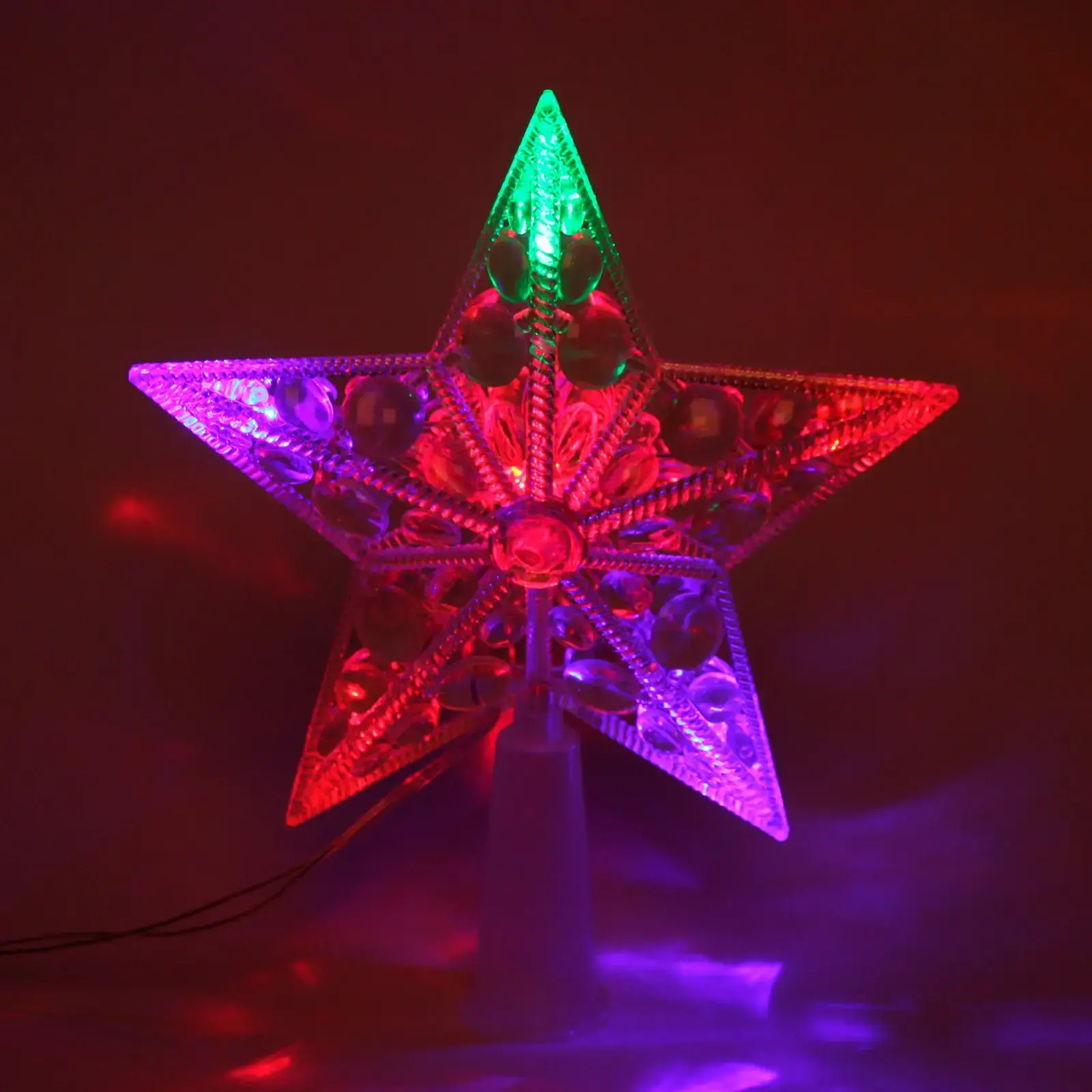 Размер звезды составляет 15 см, а её конструкция позволяет легко установить её на столе или подоконнике. Прозрачный материал с рифленой текстурой добавляет дополнительный декоративный эффект, а цветовая гамма включает красный, зеленый и фиолетовый оттенки, создавая праздничное настроение. Не упустите возможность сделать ваш праздник незабываемым с этой великолепной светодиодной звездой!