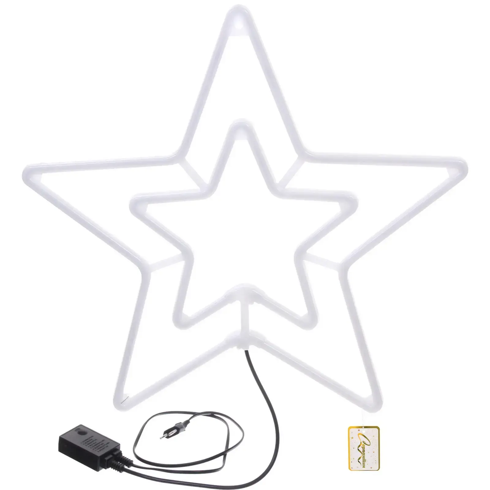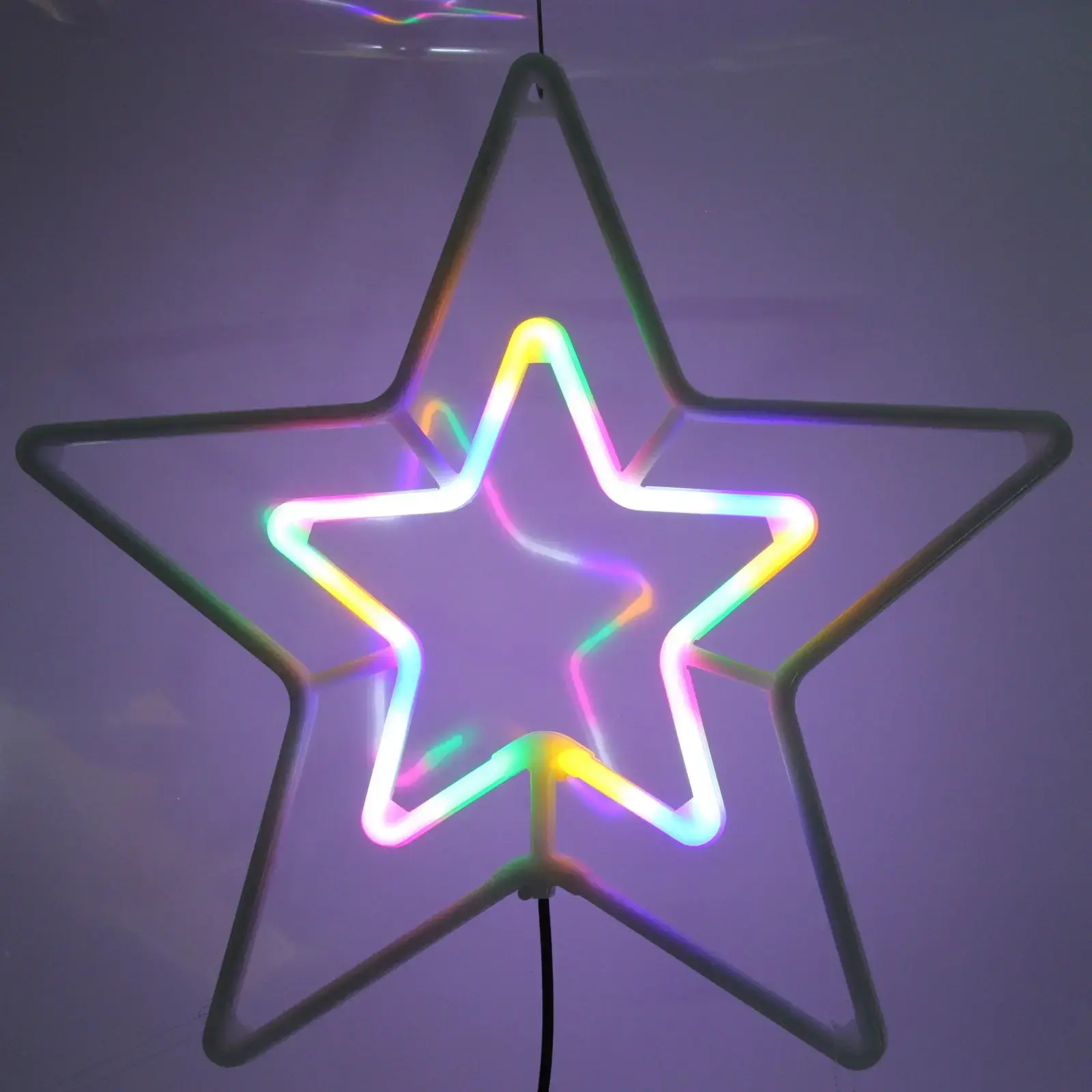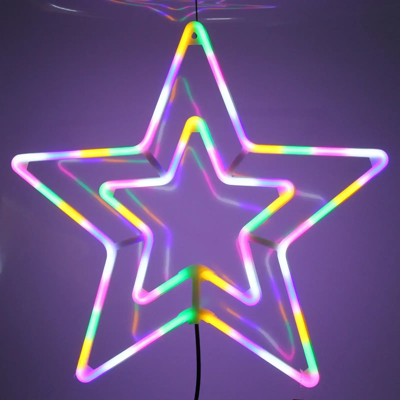 Фигура выполнена из качественных материалов: металл и пластик, что гарантирует её долговечность. Мультицветное свечение включает в себя яркие оттенки розового, зеленого, желтого и синего, создавая эффектный визуальный ряд. Размеры и форма звезды делают её универсальным элементом декора, который будет уместен как в интерьере, так и на улице.