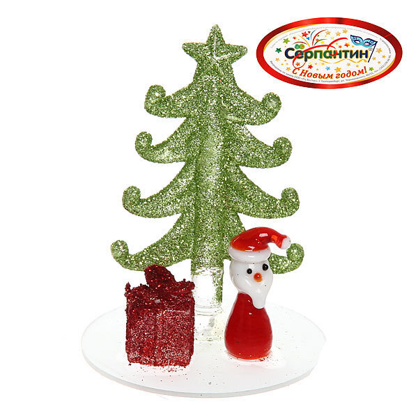 Фигурка изображает Деда Мороза с подарком, стоящего рядом с ёлочкой, выполненной из блестящего материала. Все элементы композиции тщательно проработаны, что делает её привлекательной и запоминающейся. Размеры фигурки составляют 8 см, что делает её компактной и удобной для размещения в любом уголке вашего дома.