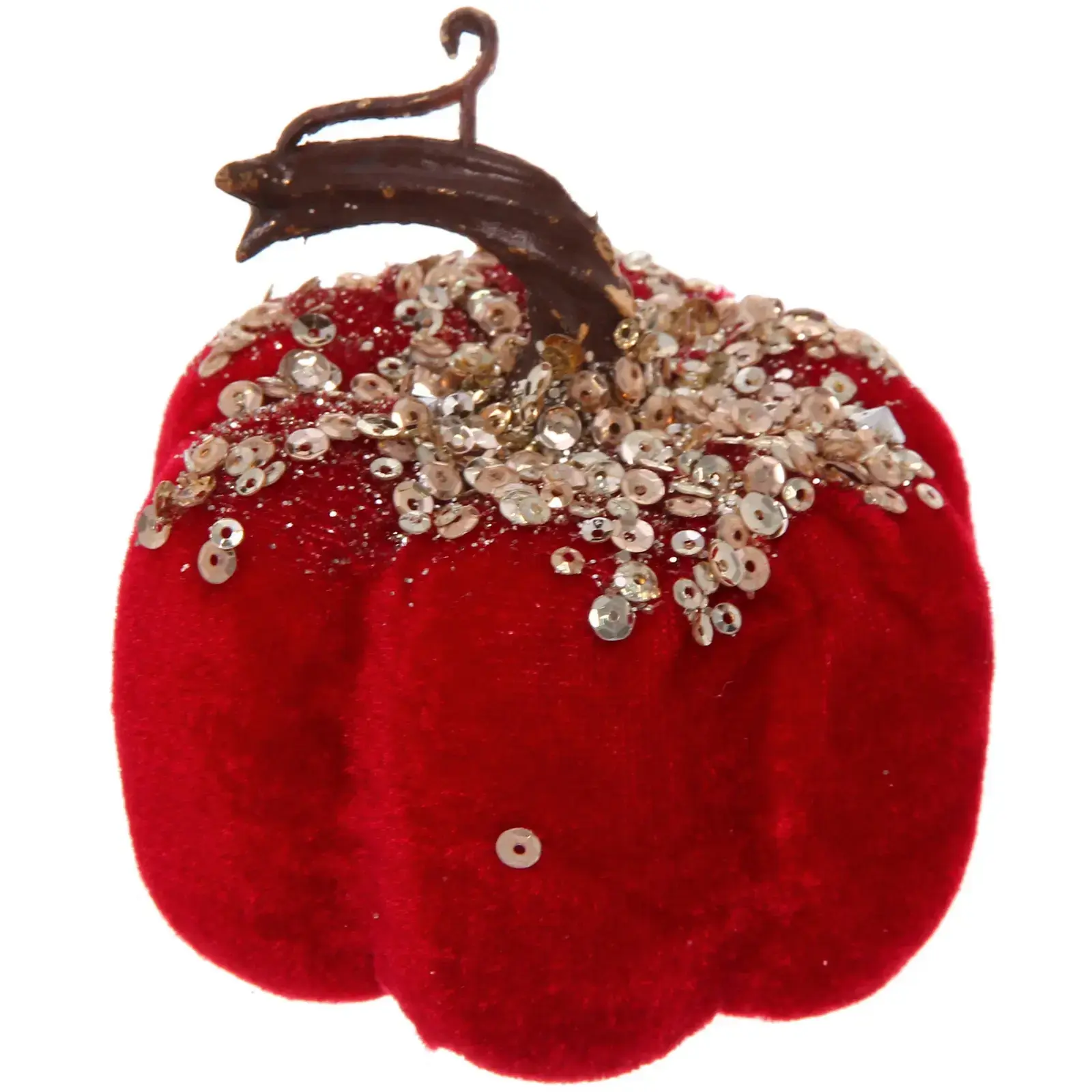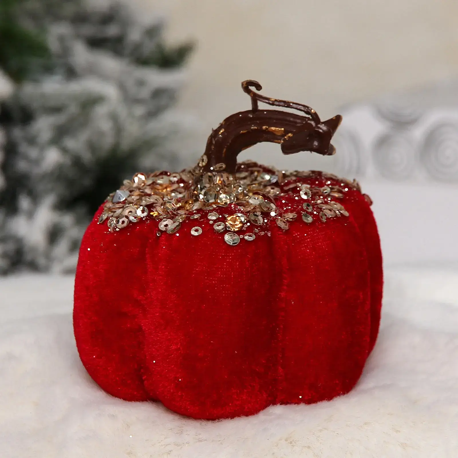 Декоративная фигурка 'Блестящая тыква' станет ярким акцентом в вашем новогоднем оформлении. Благородный бордовый цвет в сочетании с мерцающими золотистыми деталями создает роскошный праздничный образ.