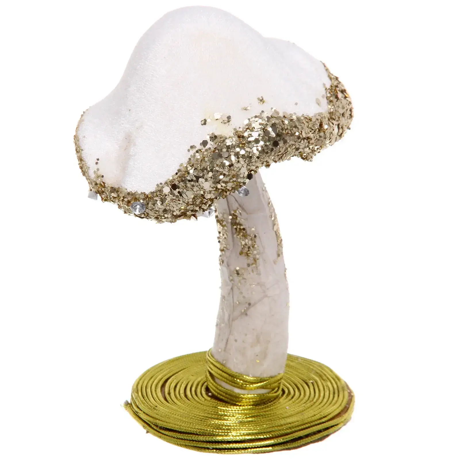 Шляпка гриба выполнена из мягкого пушистого материала с нежным блеском. Края украшены золотистым глиттером, который переливается при попадании света. Ножка стилизована под натуральное дерево, что добавляет естественности образу.