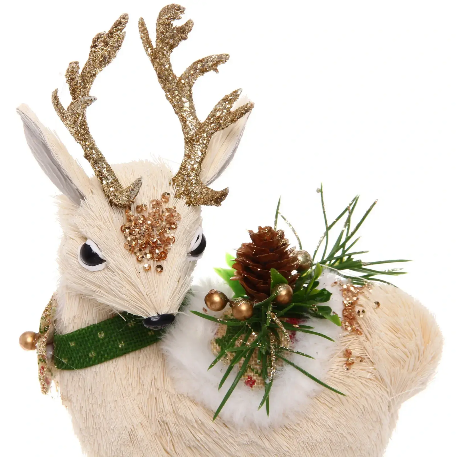 Фигурка выполнена из качественных материалов: мягкого пвх, имитирующего пушистый мех, и текстильных элементов. Блестящие золотистые рога с глиттером добавляют особого шарма, а декоративные элементы - галстук, хвойные веточки и шишка - делают образ завершенным.