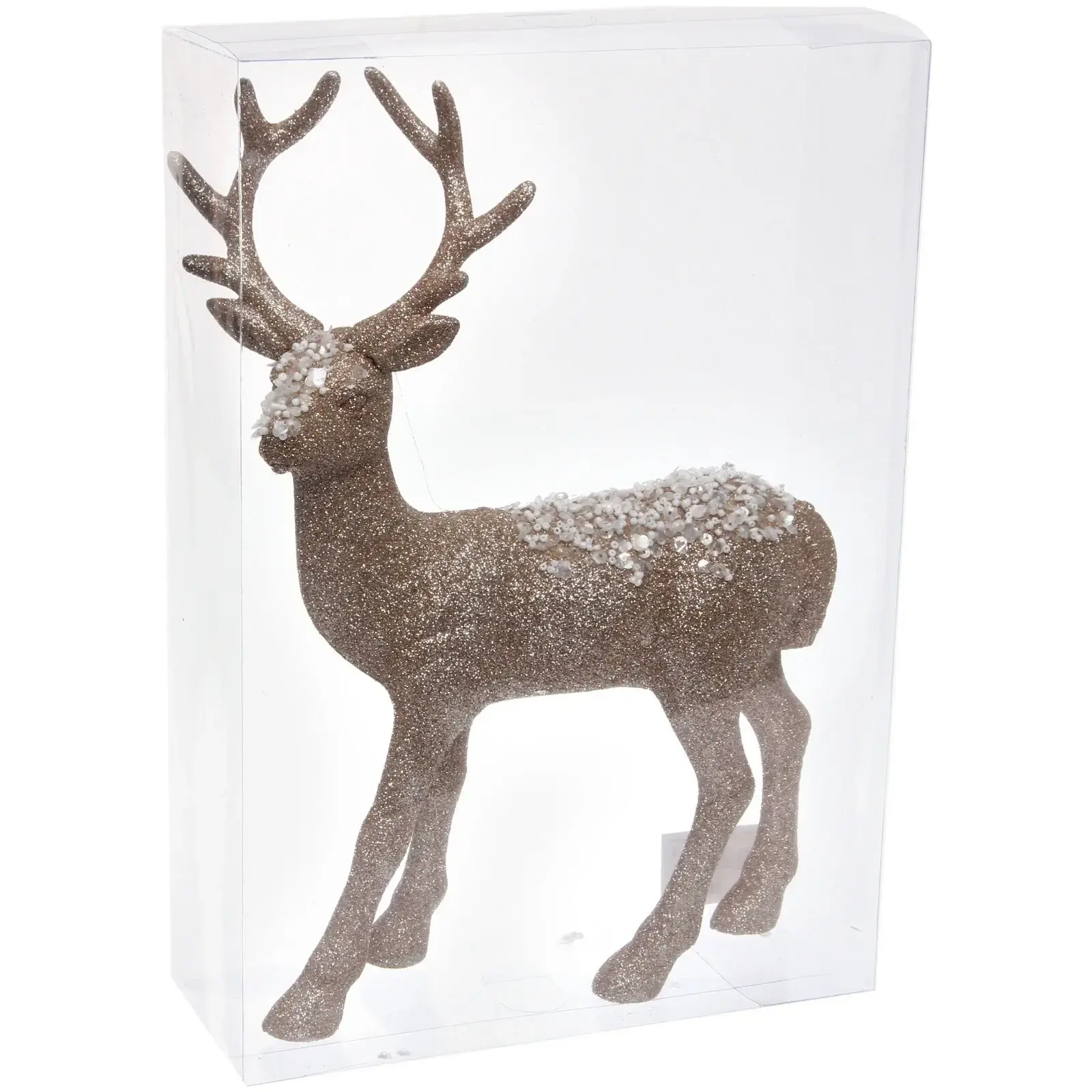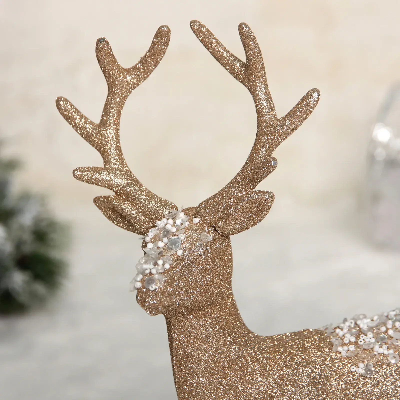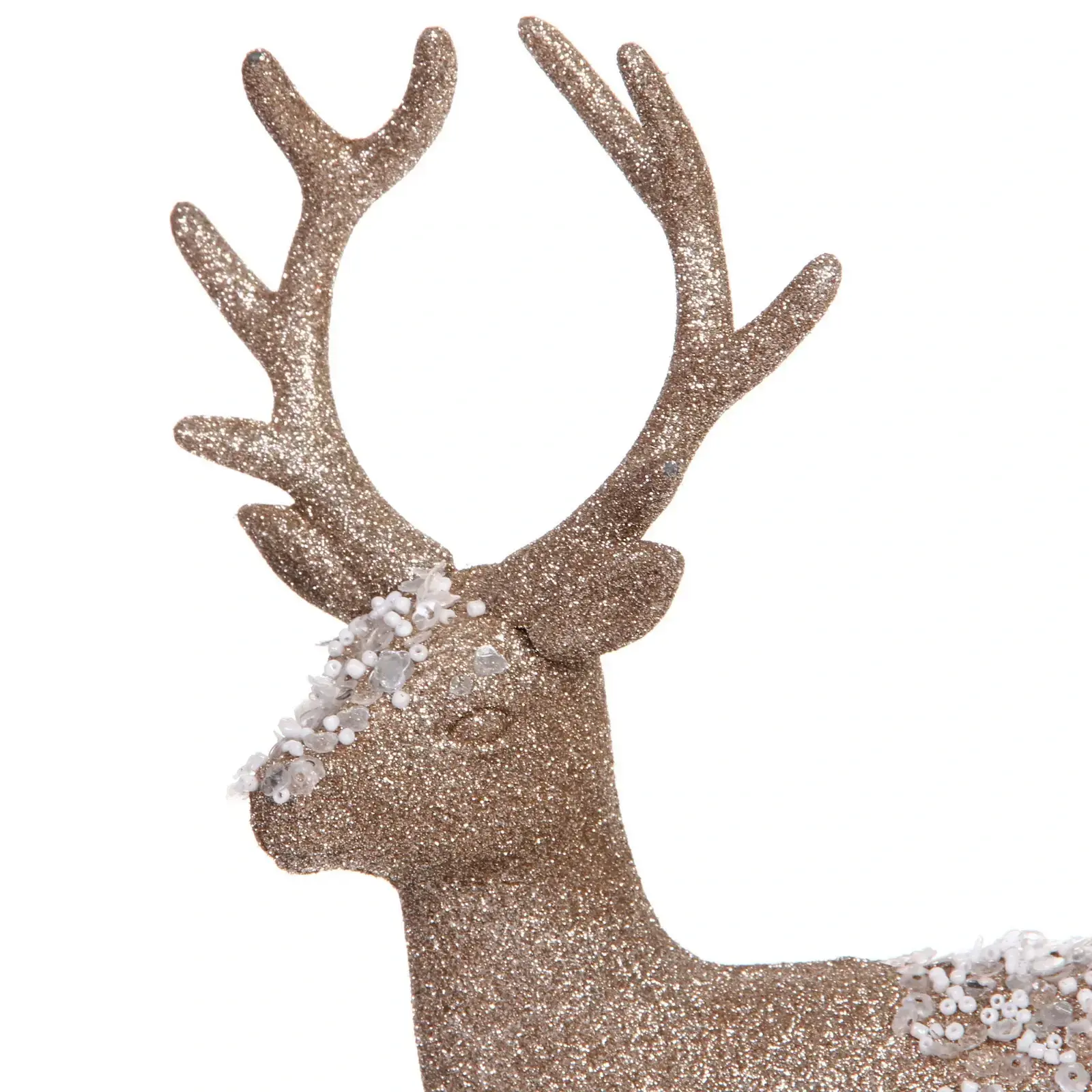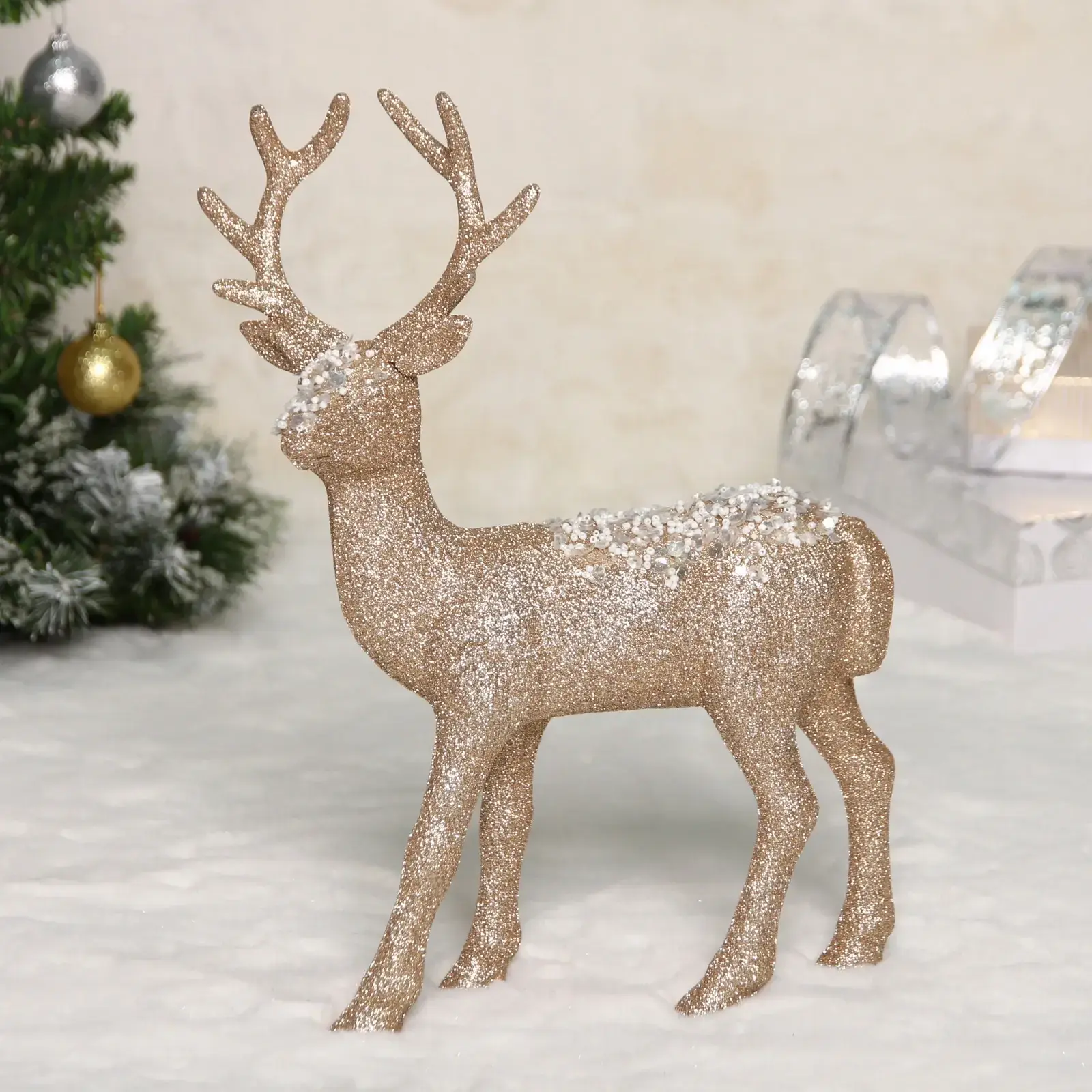 Тщательно продуманный дизайн сочетает реалистичные черты животного с праздничным декором: мерцающие блестки, белые акценты на спине и детализированные рога. Материал устойчив к повреждениям, что гарантирует долговечность использования.