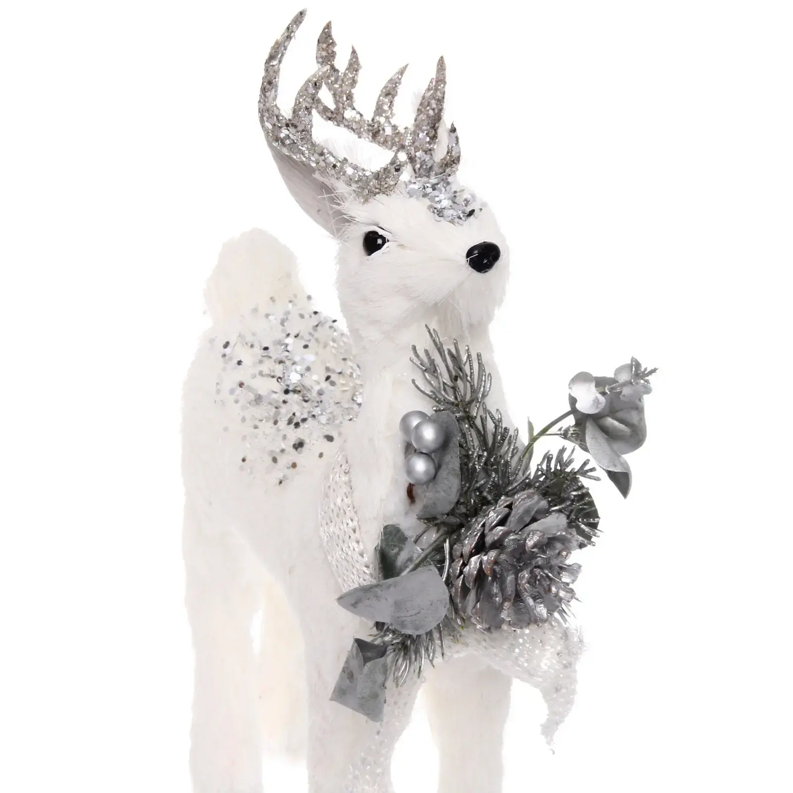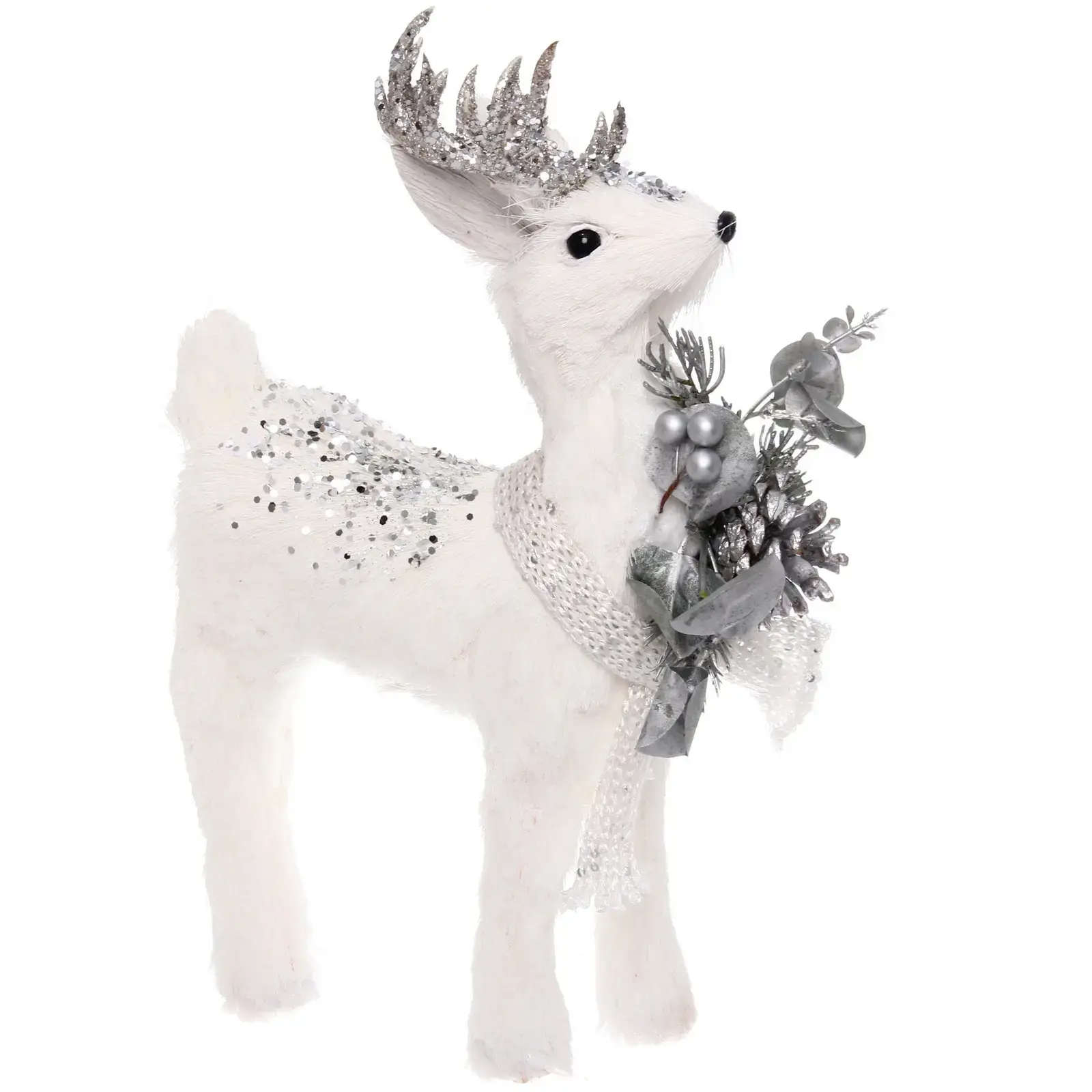 Благодаря сочетанию мягких текстур и блестящих элементов, олень выглядит особенно эффектно. Серебристые рога и декоративные детали переливаются при искусственном освещении, создавая магическую новогоднюю атмосферу.