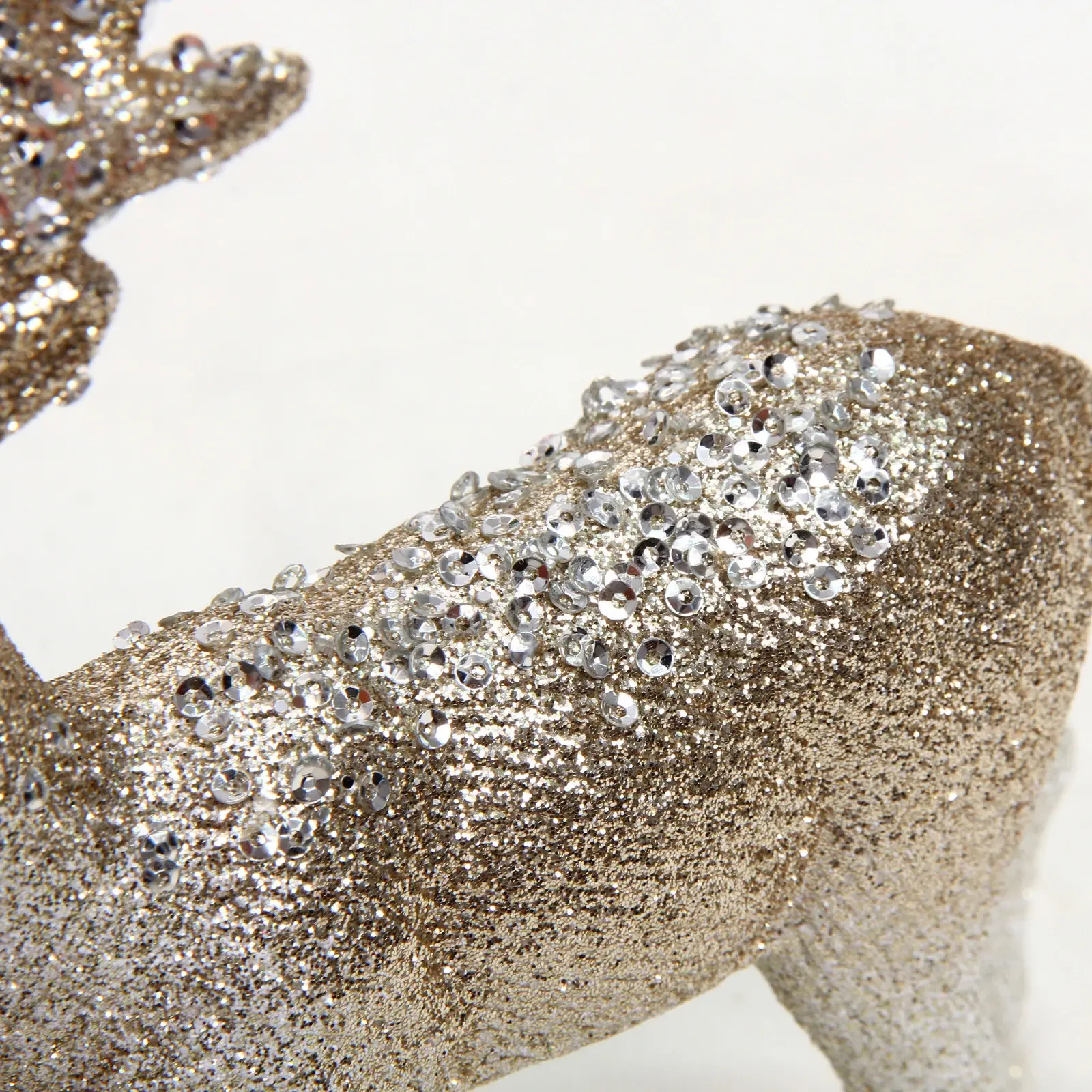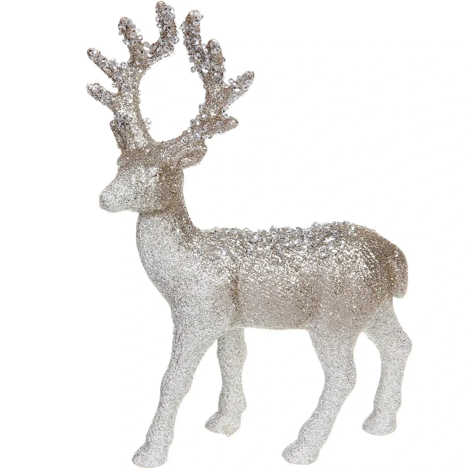 Фигурка «Прекрасный олень» станет ярким акцентом праздничного декора, создавая атмосферу уюта и зимней сказки. Изысканное сочетание белого и шампань, дополненное блеском серебристого и золотистого глиттера, привлекает внимание и гармонично вписывается в любую новогоднюю композицию.