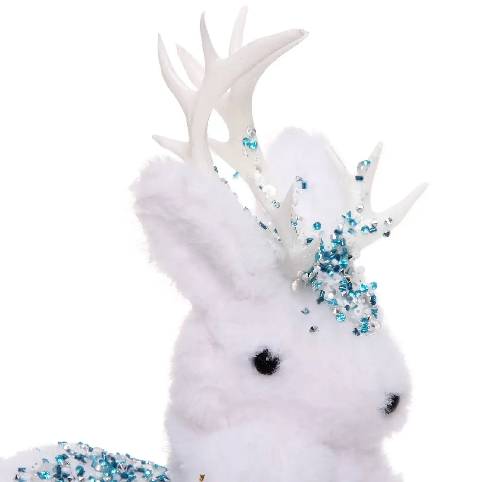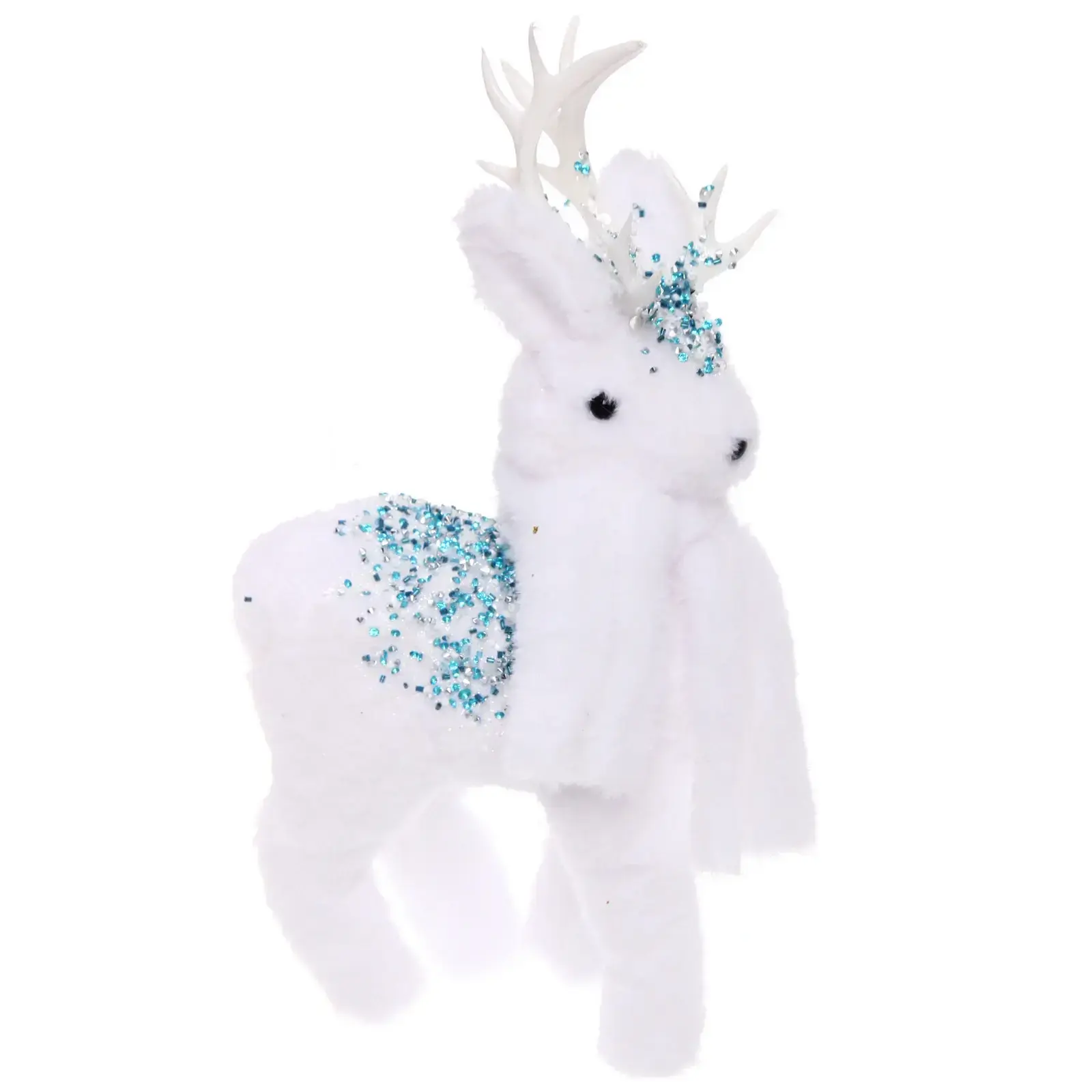 Фигурка имеет размеры 20×10×38 см, выполнена в белом цвете с голубыми и прозрачными блестящими элементами. Рога украшены стеклянными бусинами, создающими эффект инея.