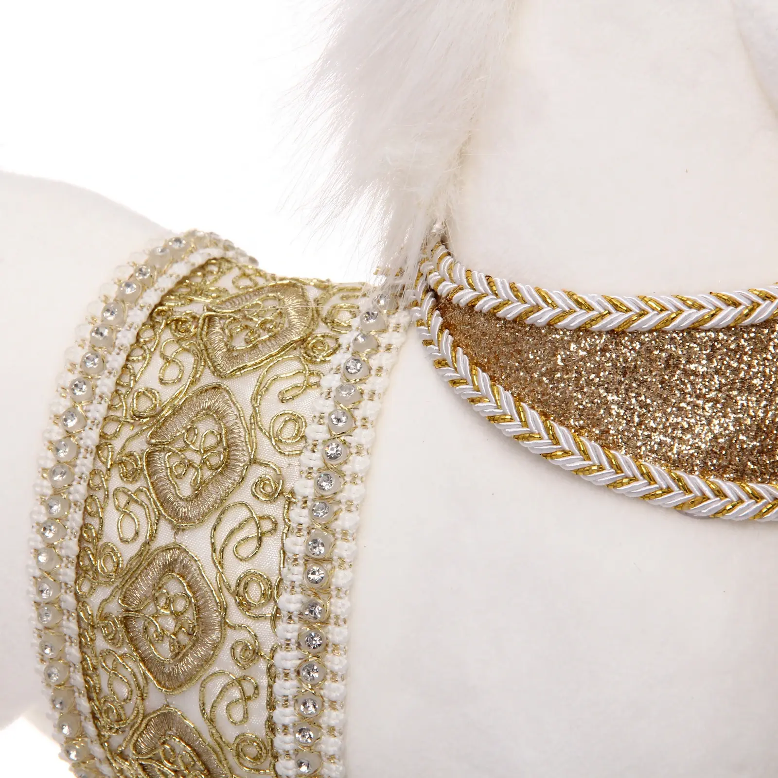 Фигурка отличается высоким качеством исполнения: мягкий приятный на ощупь материал корпуса дополнен изящной золотистой отделкой. Пушистая грива и хвост создают особую текстурную привлекательность, а тщательно продуманные детали упряжи демонстрируют мастерство изготовления.