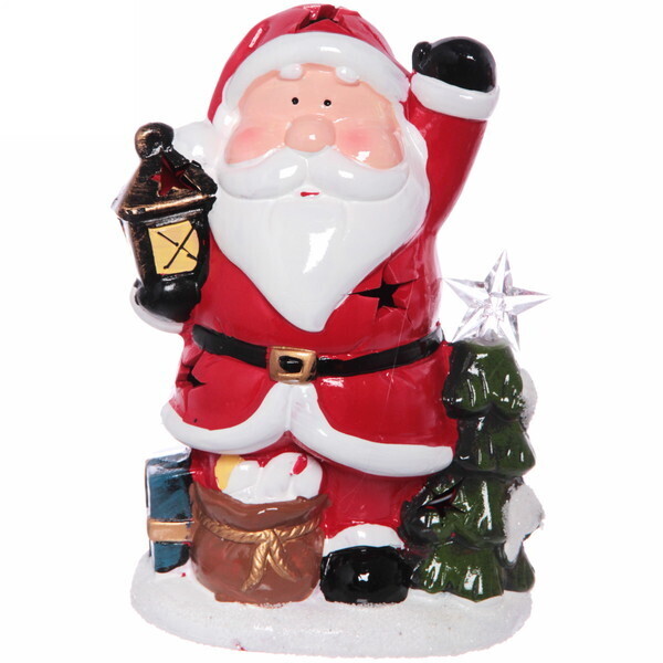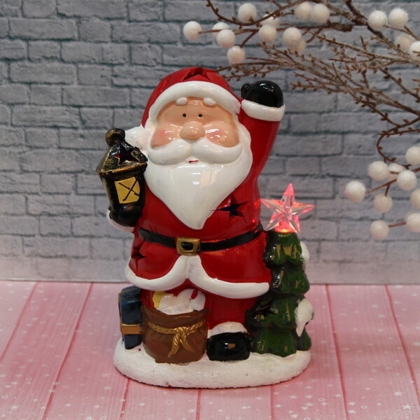 Фигурка имеет размеры 20х13 см и выполнена в традиционных новогодних цветах: красном, белом и зелёном. Она изображает Деда Мороза с поднятой рукой и фонарём, рядом с ним расположена ёлочка с светящейся звездой. Такой элемент декора станет не только украшением, но и символом праздника, который будет радовать вас и ваших близких каждый год.