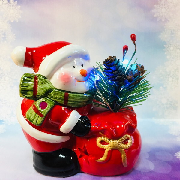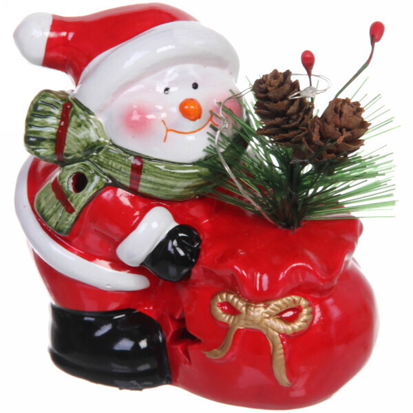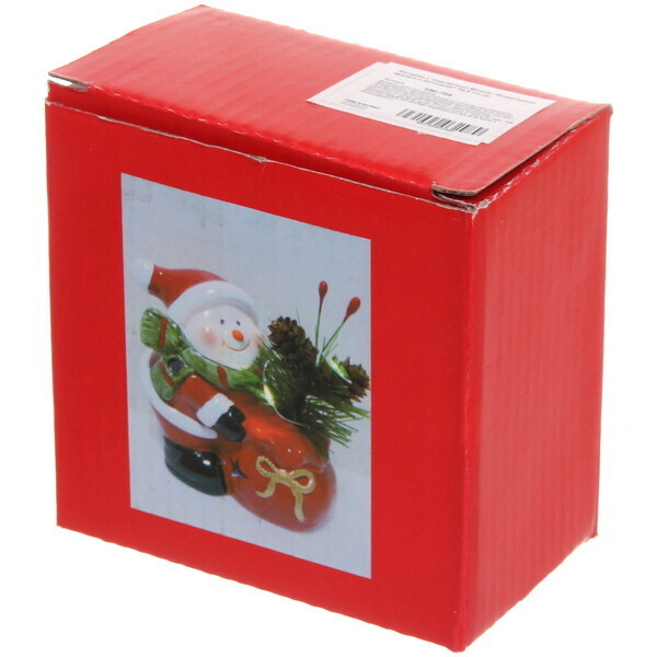 Фигурка выполнена из керамики и имеет глянцевую поверхность, что придаёт ей особый шарм. Она может быть использована как самостоятельный элемент декора или в сочетании с другими новогодними украшениями. Размеры фигурки 10,6 см в ширину и 13 см в высоту делают её компактной и удобной для размещения на полках, столах или подоконниках.