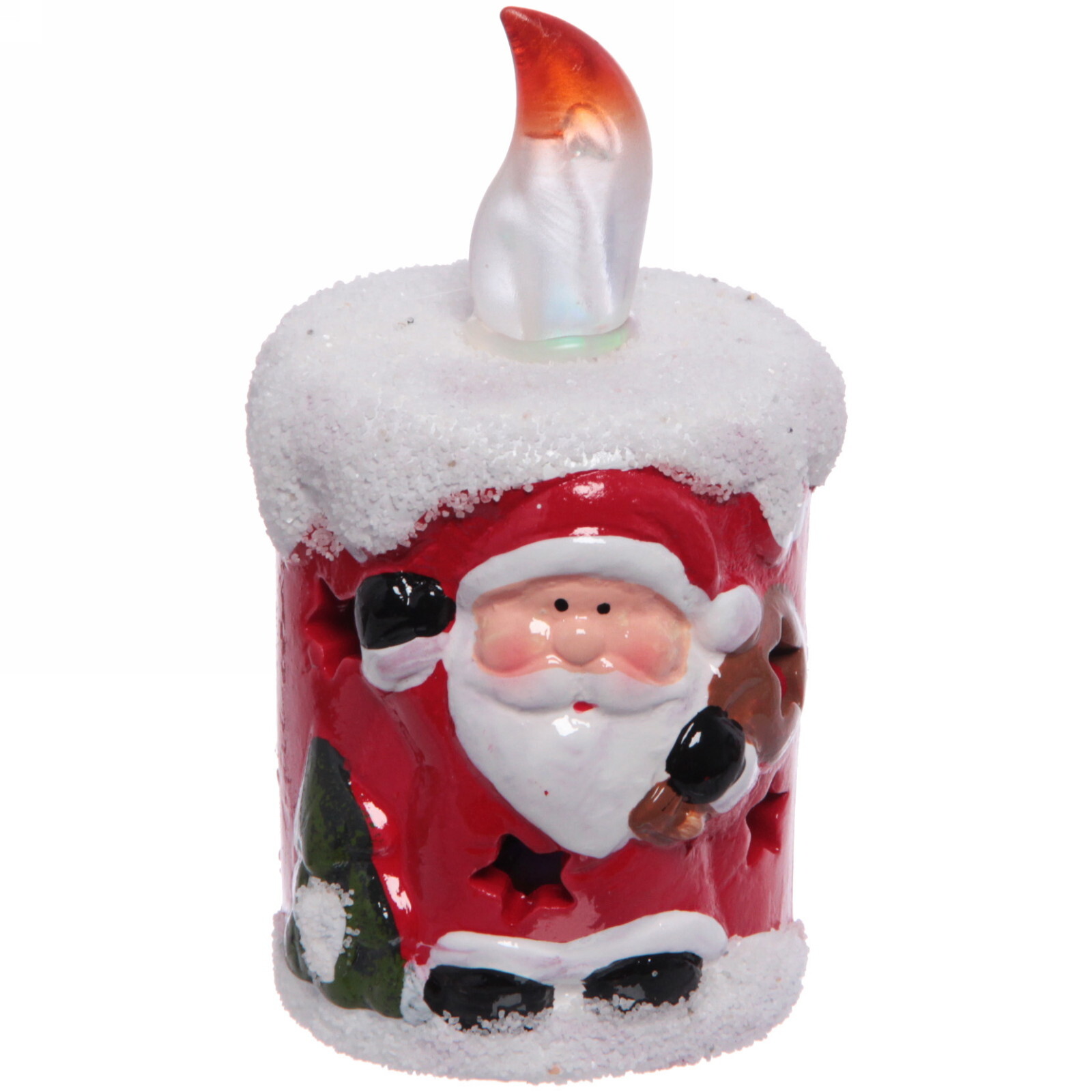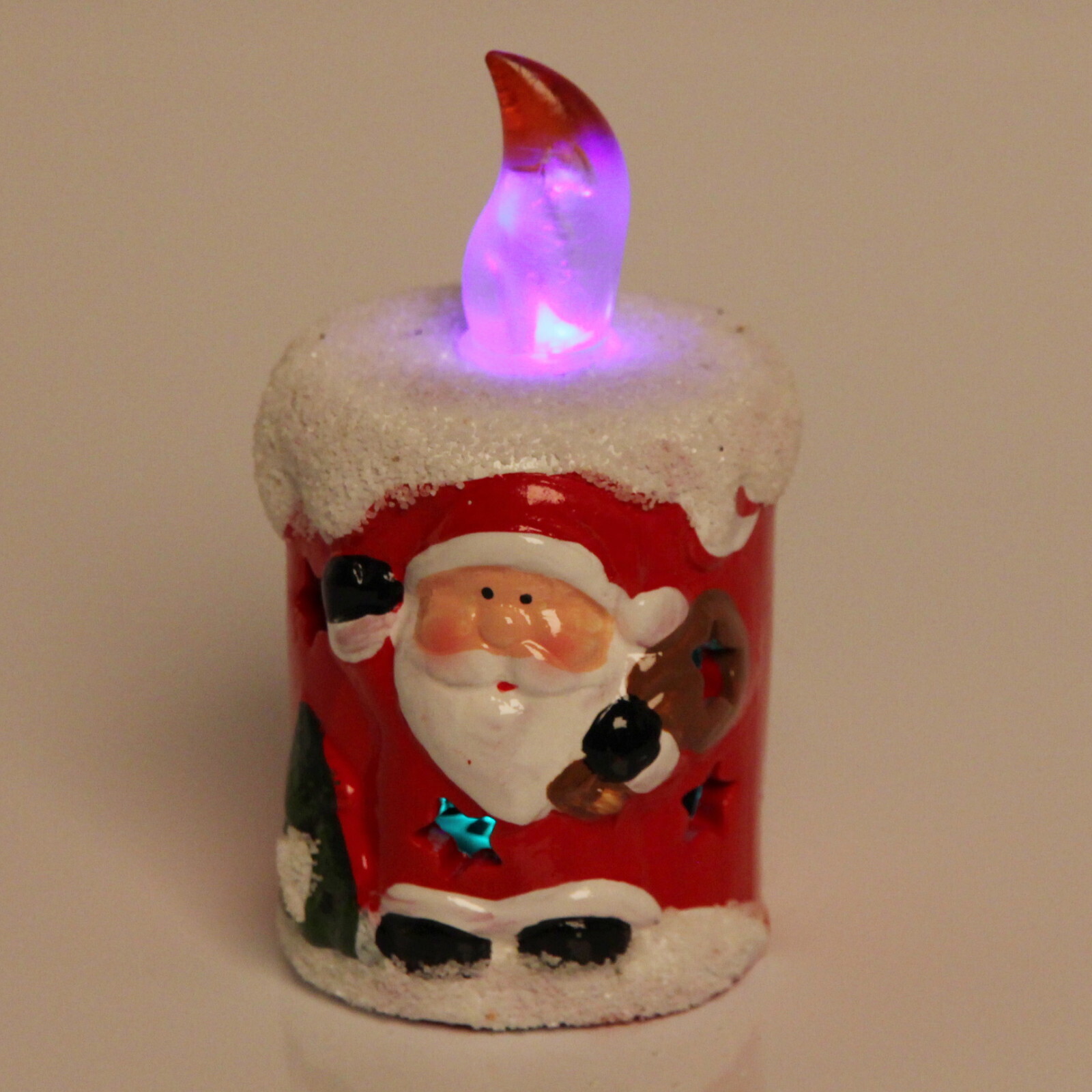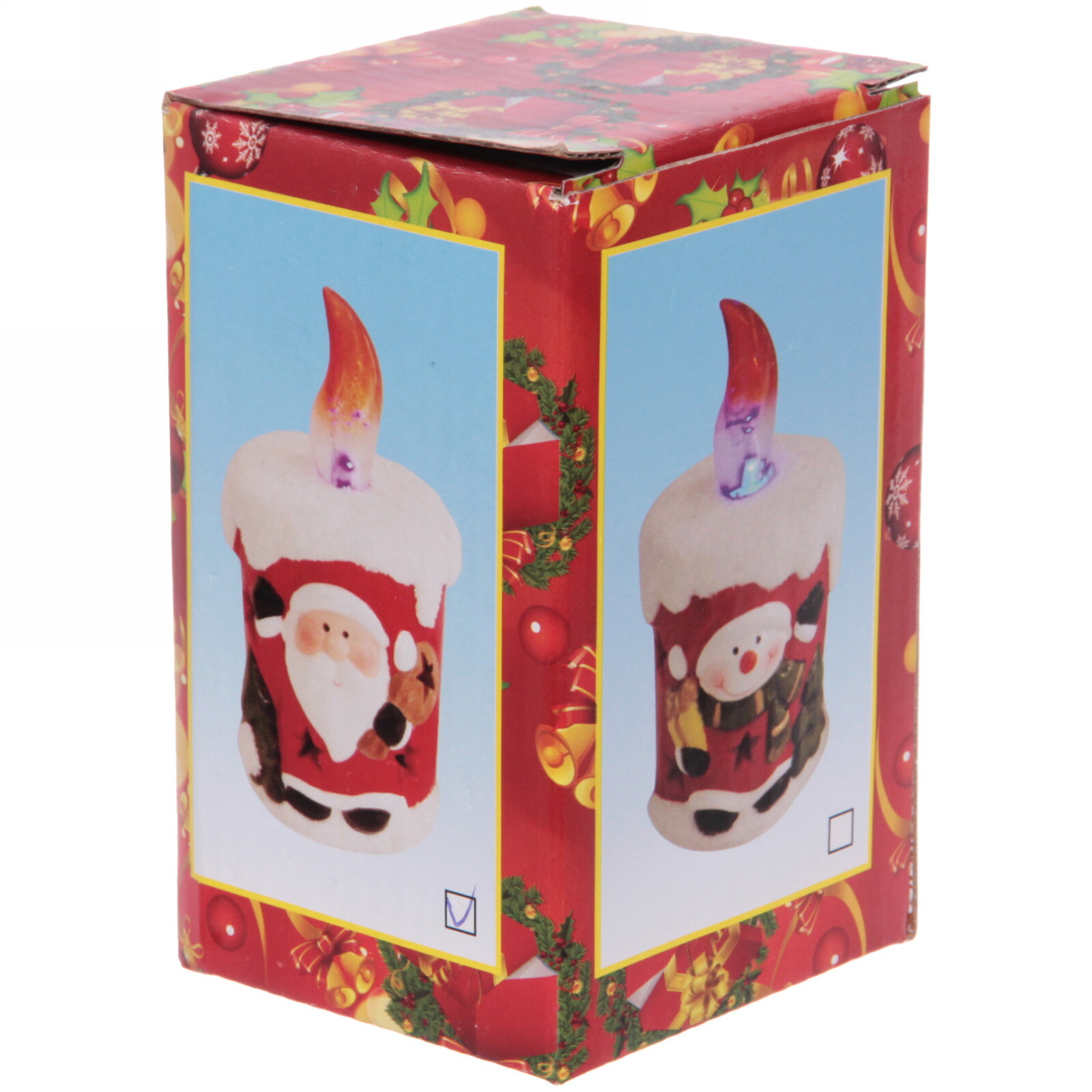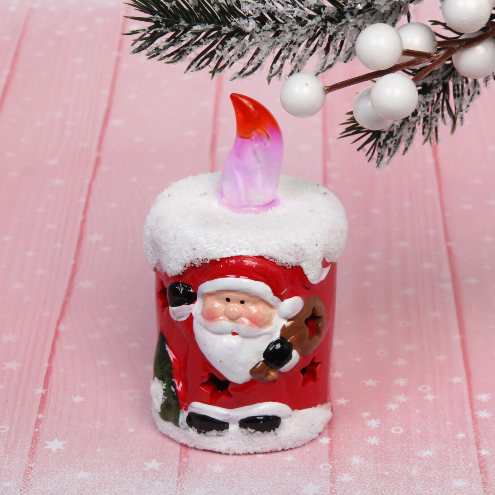 Фигурка имеет красный цвет с белым верхом, имитирующим снег, и украшена изображением Санта-Клауса, который держит мешок с подарками. В верхней части находится имитация пламени, окрашенная в белый и оранжевый цвета, что добавляет эффект горения. Эта фигурка станет не только украшением, но и источником радости для всей семьи.