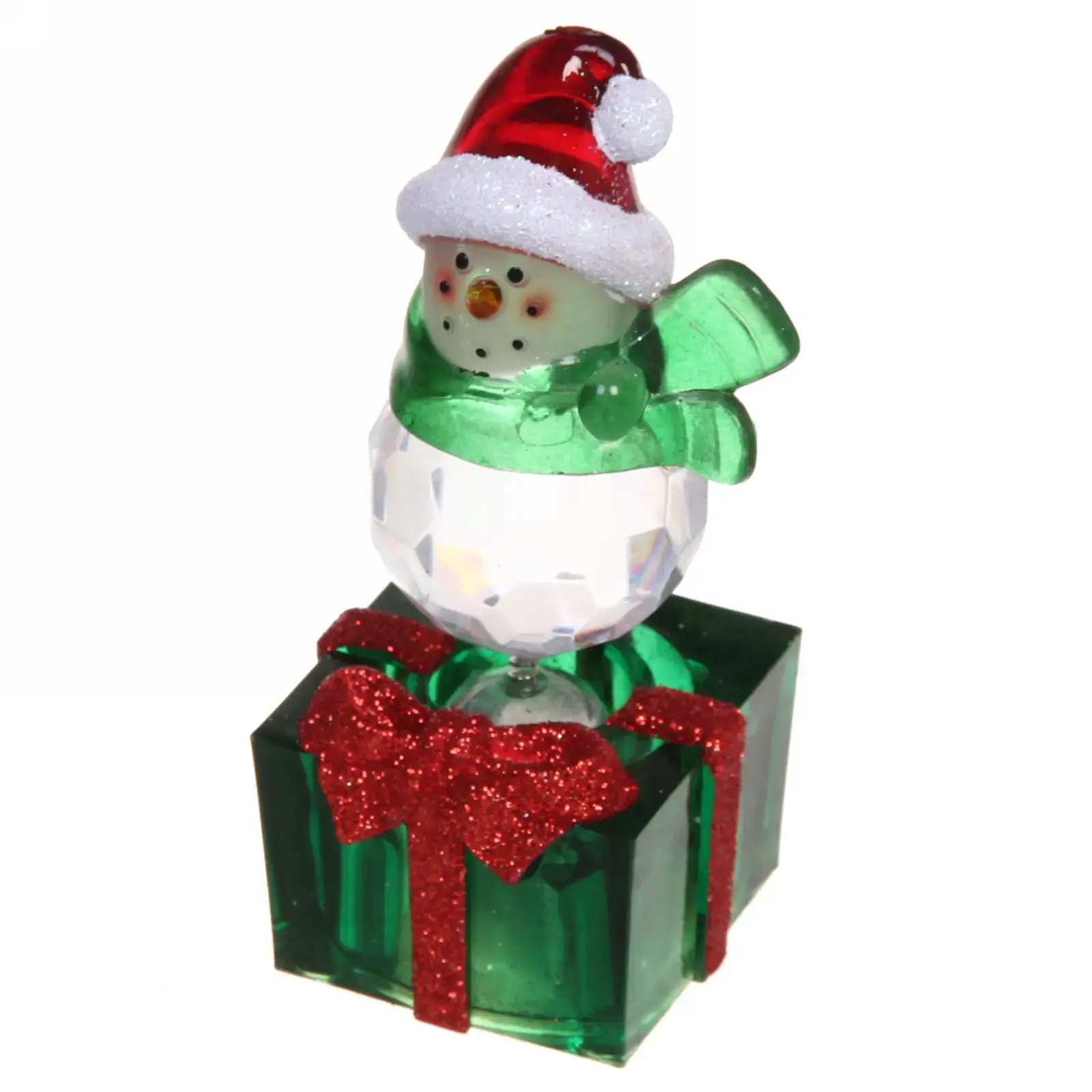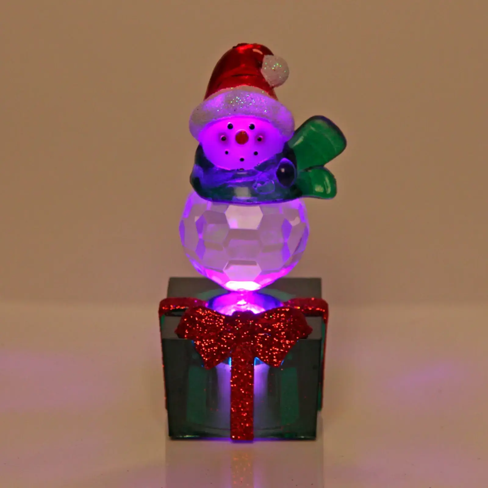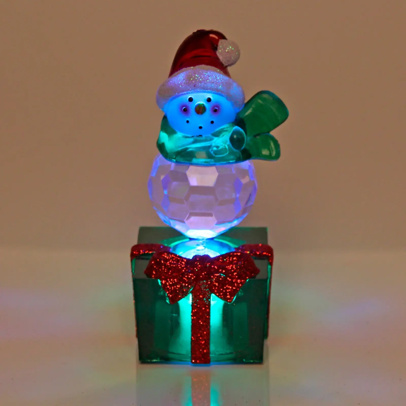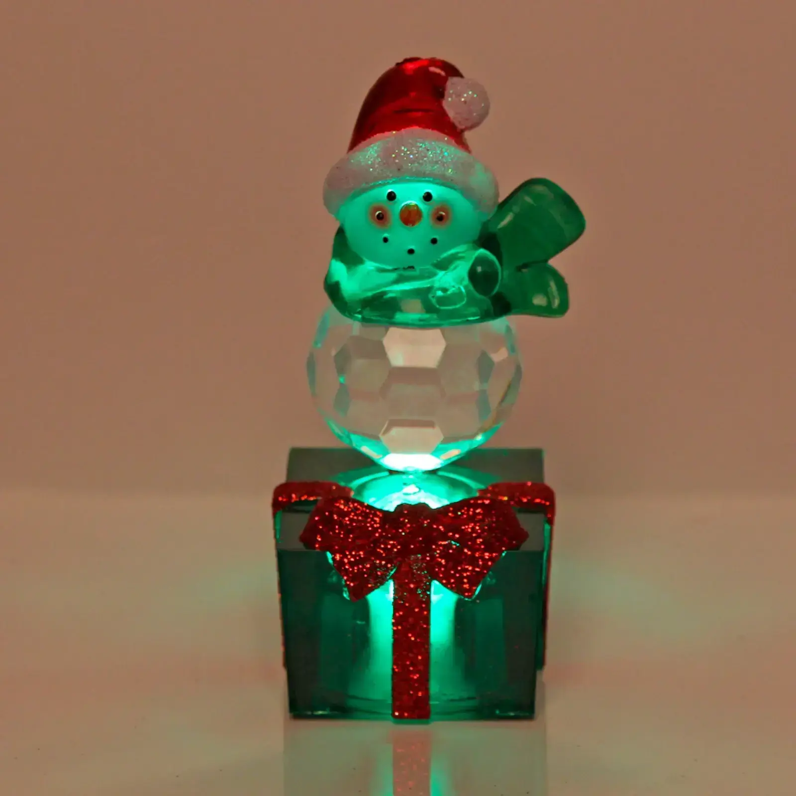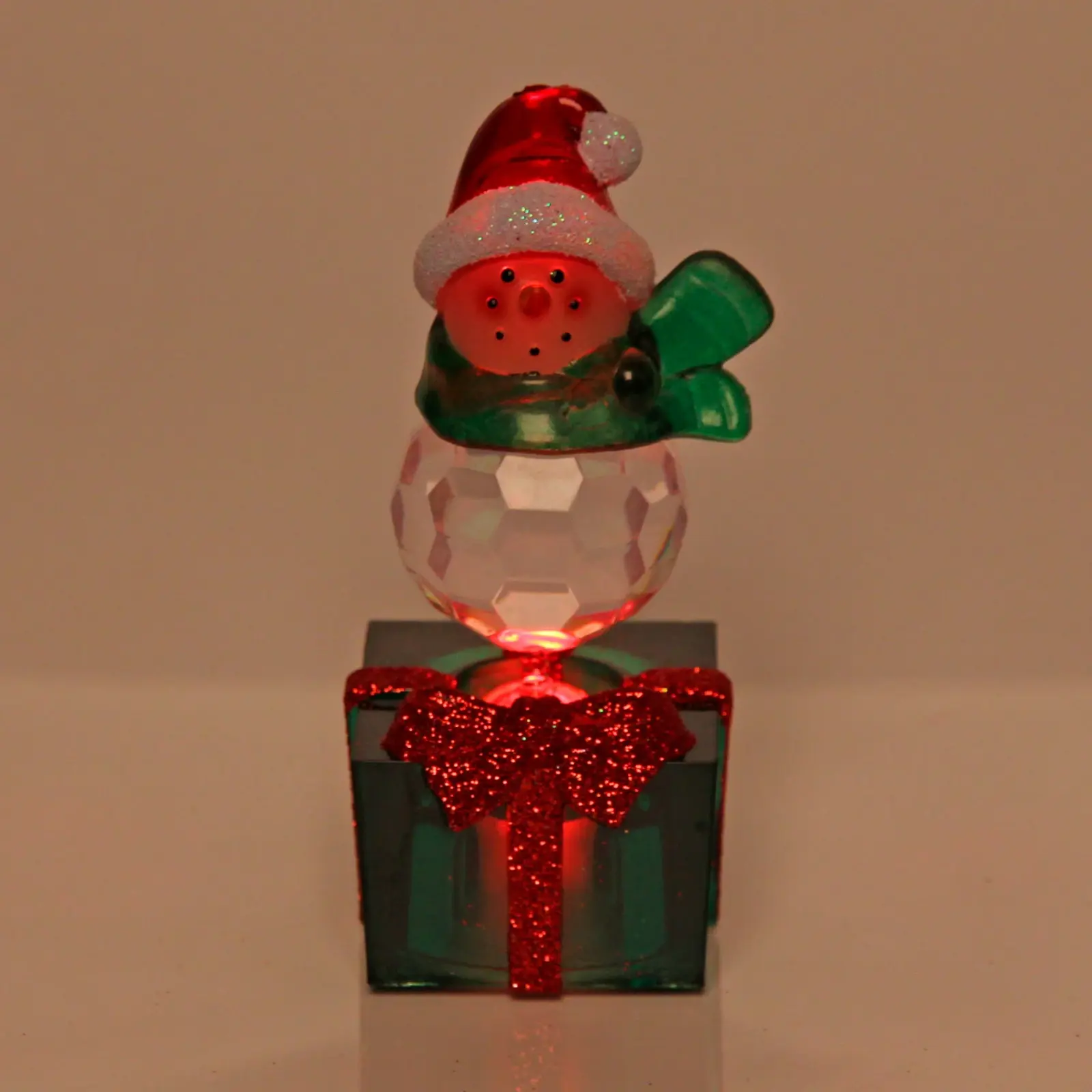 Изделие выполнено из прочного пластика, который безопасен и долговечен. Снеговик украшен детализированными элементами: красной шапочкой, зелёным шарфом и бантом на подставке. Встроенная подсветка создаёт неповторимую игру цвета — от голубого до фиолетового.