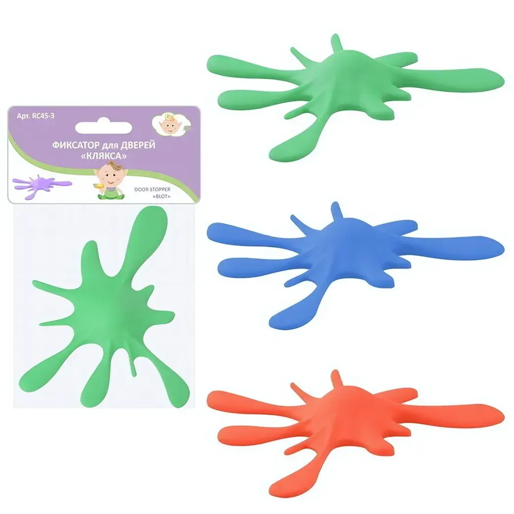 Фиксатор выполнен из качественного пластика и представлен в трех ярких цветах: зеленом, синем и оранжевом. Его форма напоминает каплю или брызги, что делает его не только функциональным, но и стильным элементом интерьера. Размеры фиксатора не указаны, но он достаточно компактен для удобного использования.