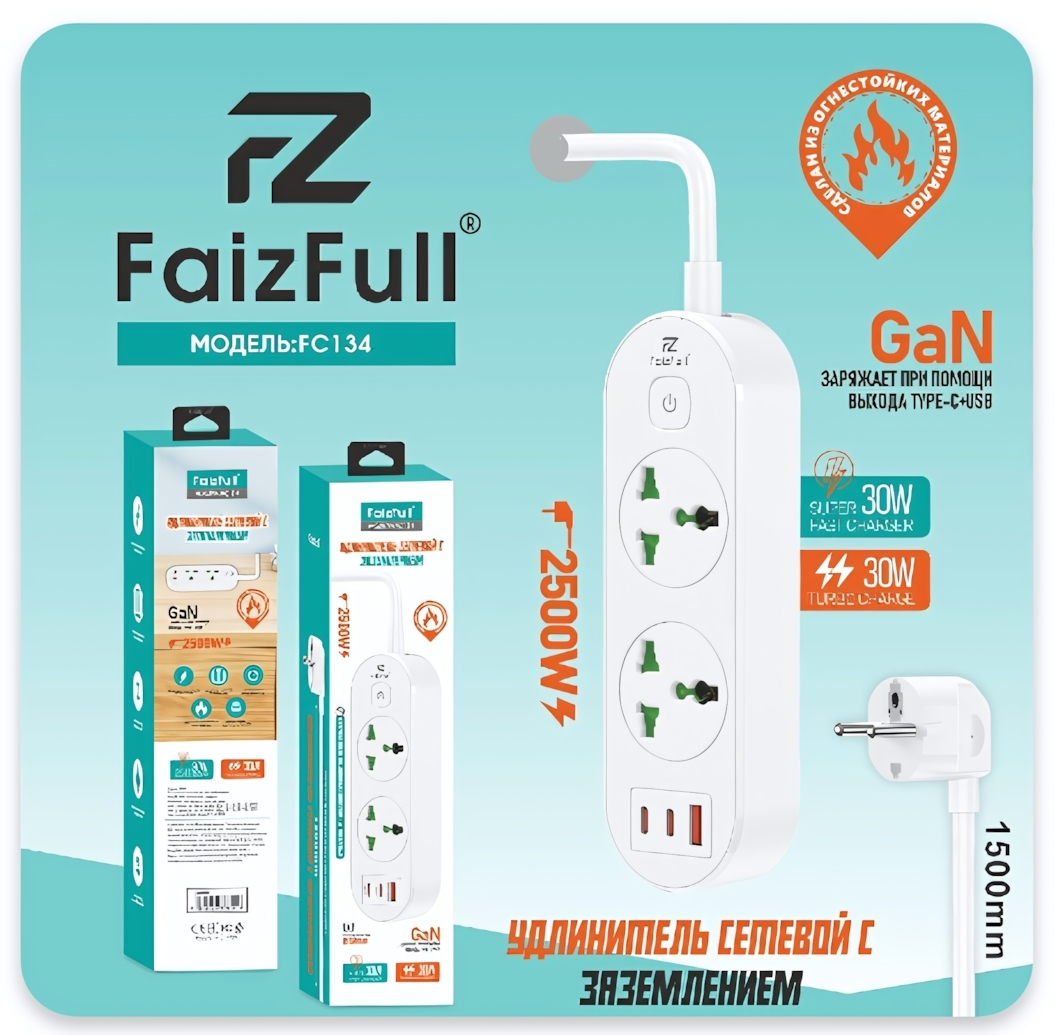 Современный сетевой фильтр FaizFull FC134 с технологией GaN — это универсальное решение для дома и офиса. Благодаря двум розеткам и трем портам (2xType-C + USB), вы можете одновременно подключать несколько устройств и заряжать их с мощностью до 30W.