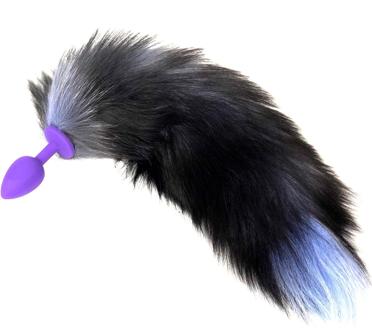 - Эстетичный дизайн: Фиолетовый силиконовый корпус гармонично сочетается с пушистым черным хвостом с серебристыми и голубоватыми переходами, создавая привлекательный визуальный образ.