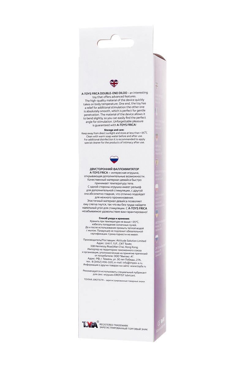 Фаллоимитатор "Frica" подойдёт для самостоятельного использования и для пар, которые хотят добавить новизны в интимную жизнь. Гладкая глянцевая поверхность облегчает уход: достаточно промыть изделие тёплой водой с мягким очищающим средством и хранить в сухом месте. Продуманная форма, гибкость и сочетание текстур делают эту модель универсальным выбором для чувственных экспериментов.