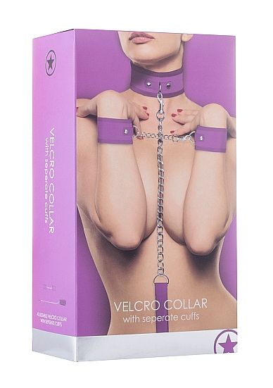 Ошейник с наручниками и цепью Velcro Collar "Ouch!", фиолетовый, натуральная кожа, регулируемый