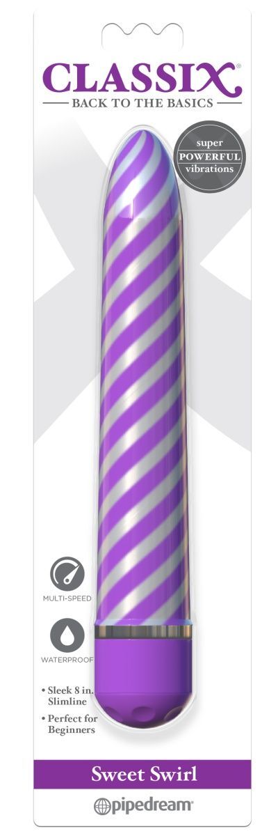 Фиолетовый вибратор Sweet Swirl — это идеальный выбор для тех, кто ищет сочетание классического дизайна и высокой функциональности. Его гладкая поверхность и обтекаемая форма обеспечивают максимальный комфорт во время использования, а мощные вибрации подарят незабываемые ощущения. Этот вибратор станет вашим надежным помощником в мире удовольствия.