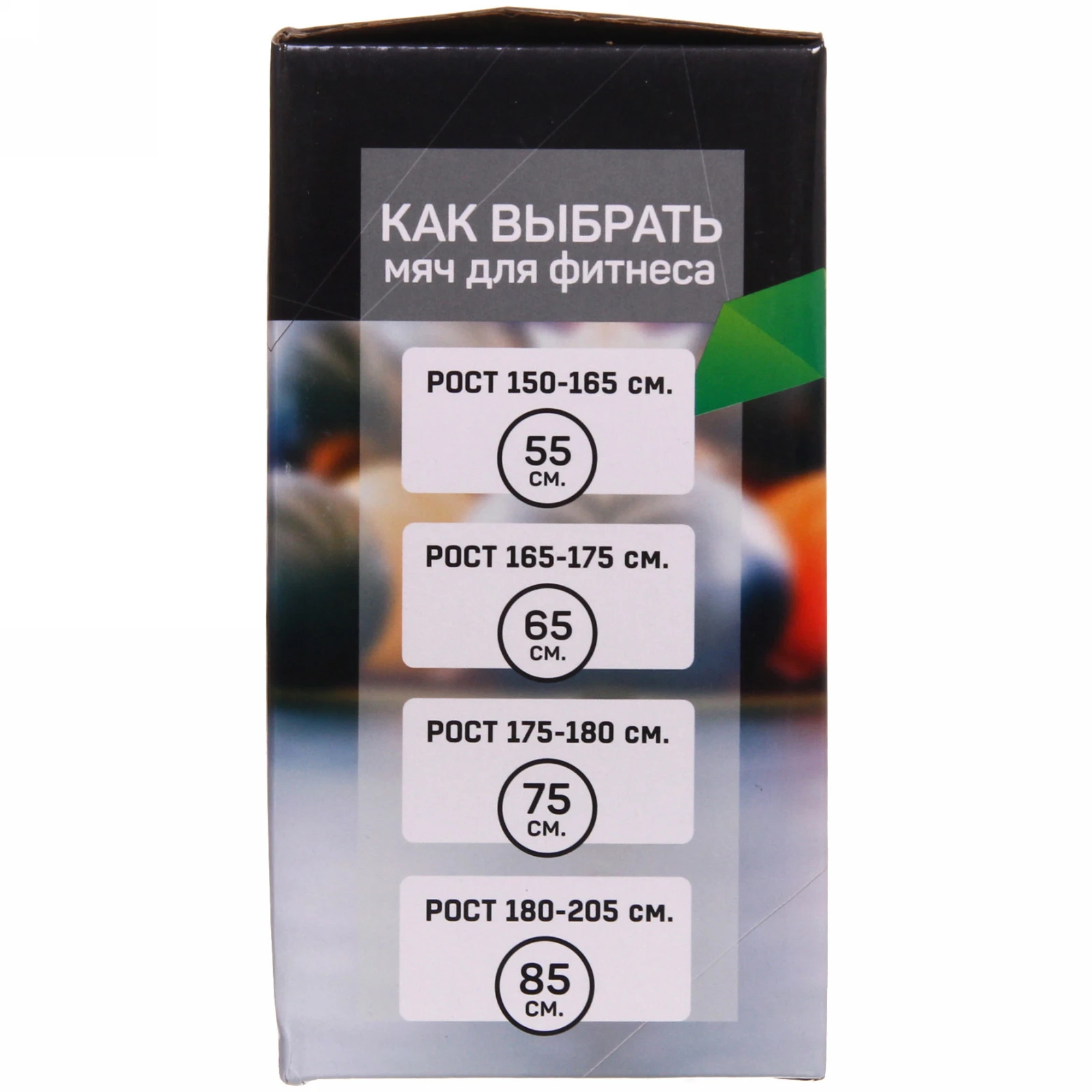 Рекомендуем мяч 65 см для роста 165-175 см. Для других параметров доступны варианты 55 см (150-165 см), 75 см (175-180 см) и 85 см (180-205 см).