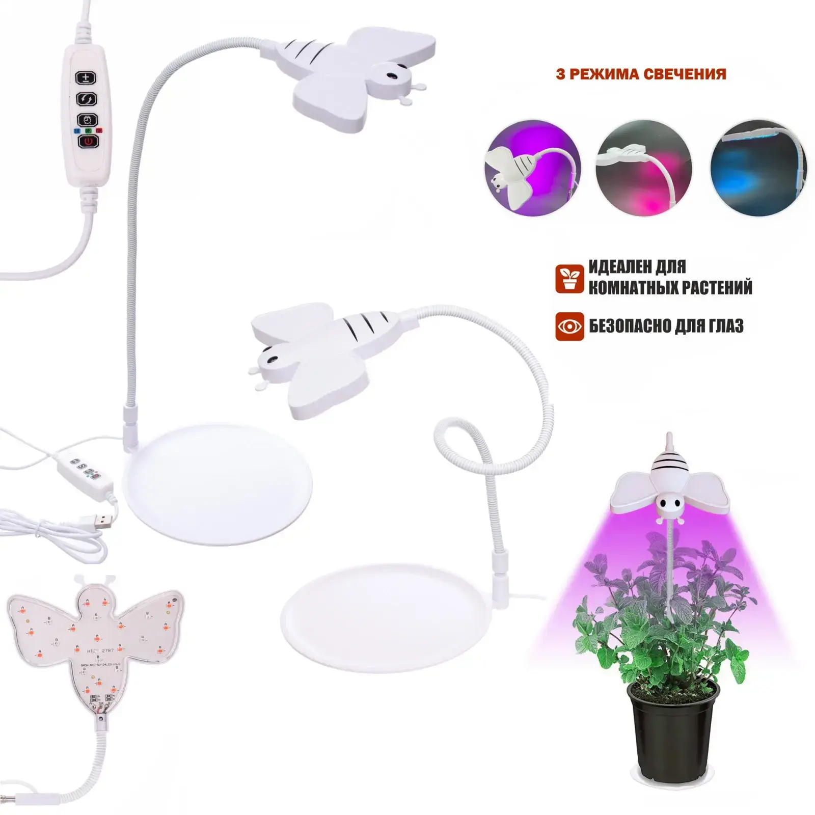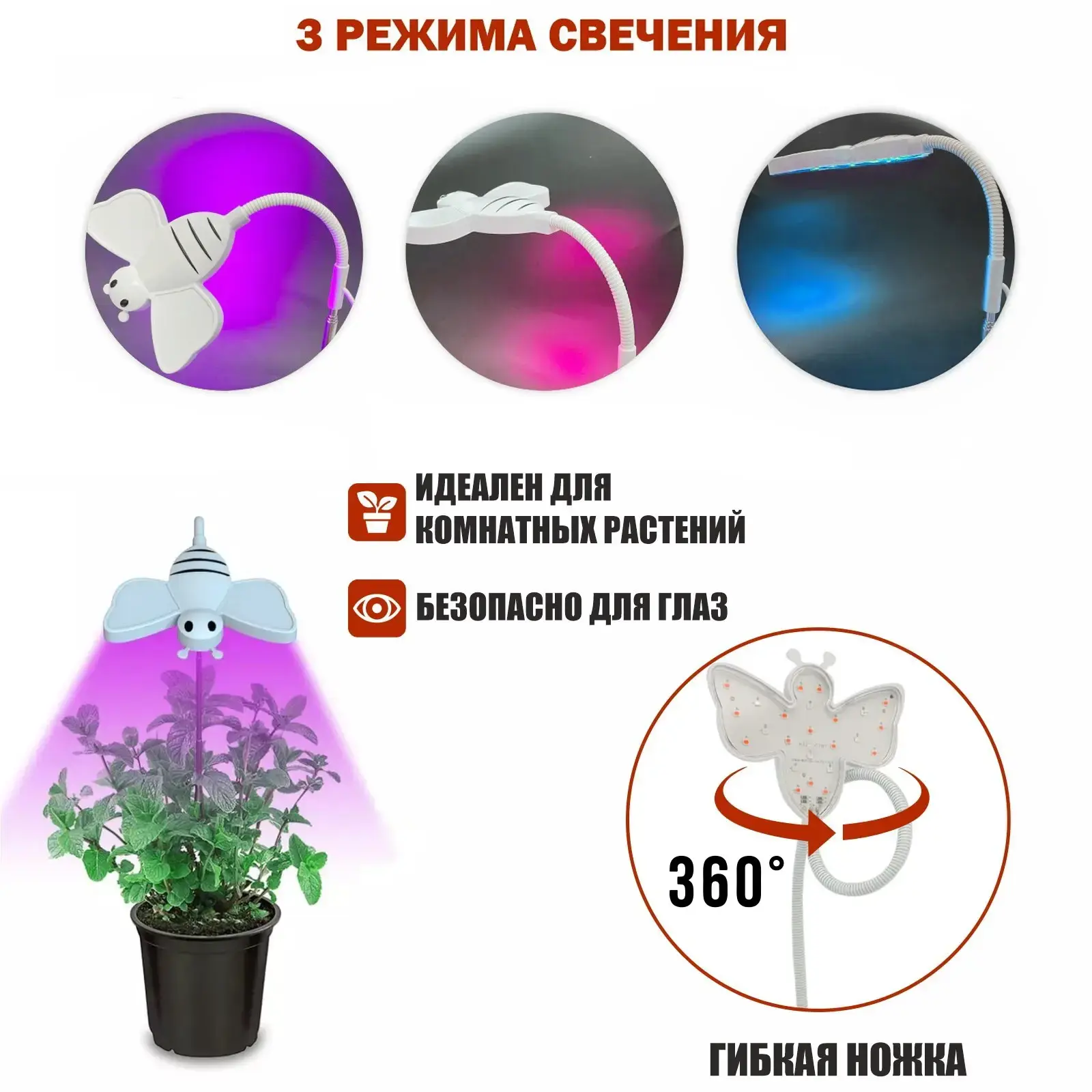 Светильник имеет 24 светодиода, которые обеспечивают яркое и равномерное освещение, способствующее фотосинтезу и здоровому росту растений. Он предлагает три режима свечения: красный, синий и белый, что позволяет выбрать оптимальный режим для ваших растений. Кроме того, устройство безопасно для глаз, что делает его идеальным для длительного использования.