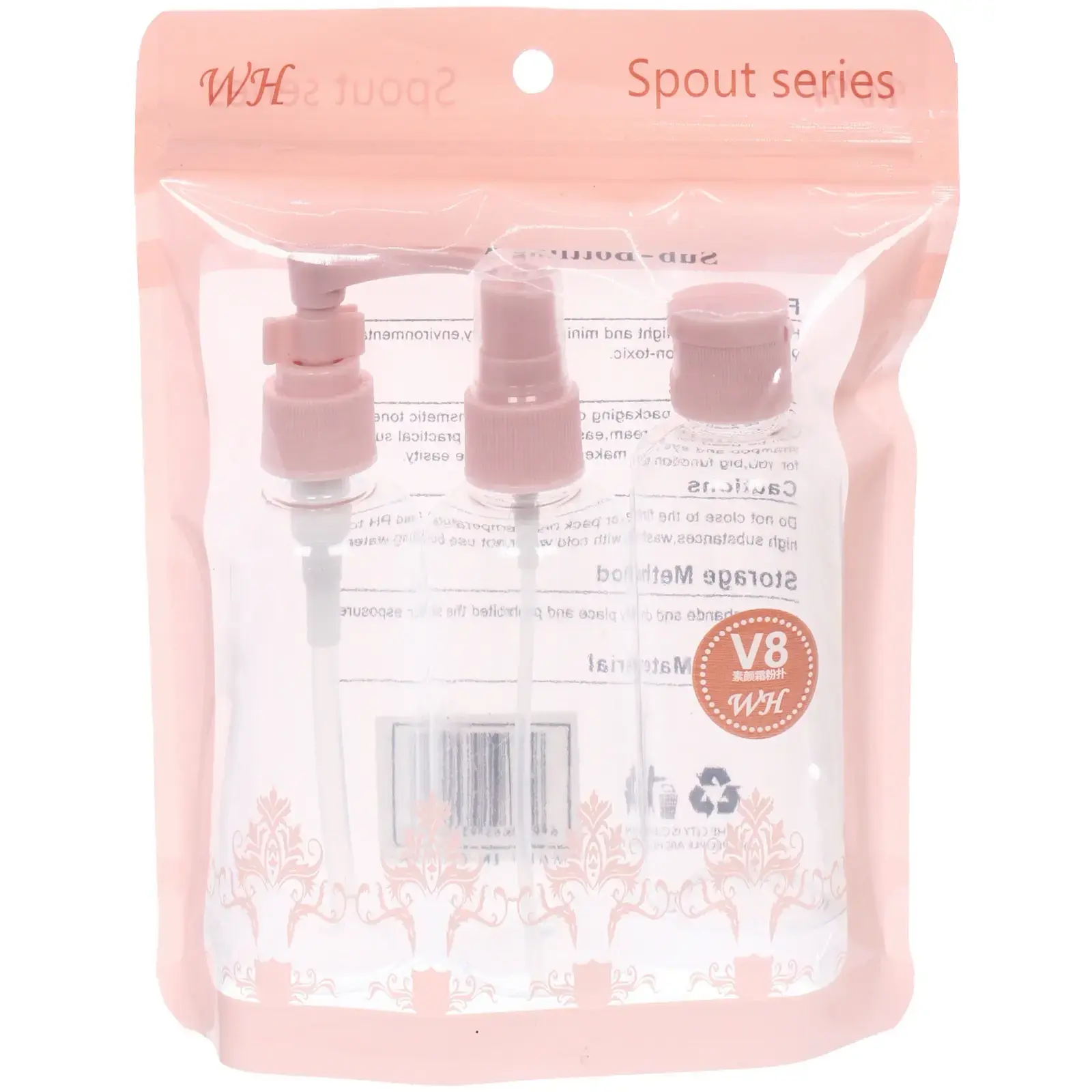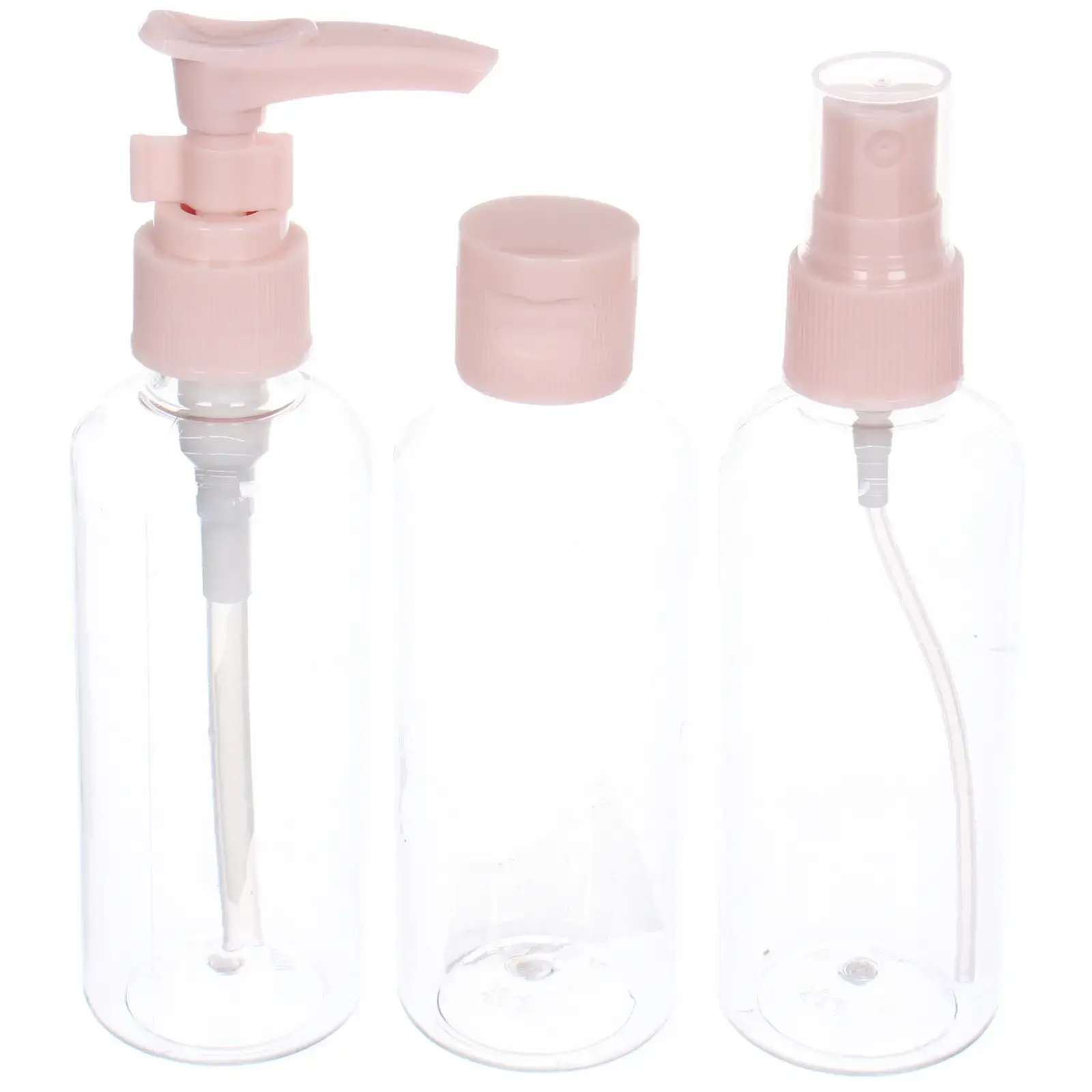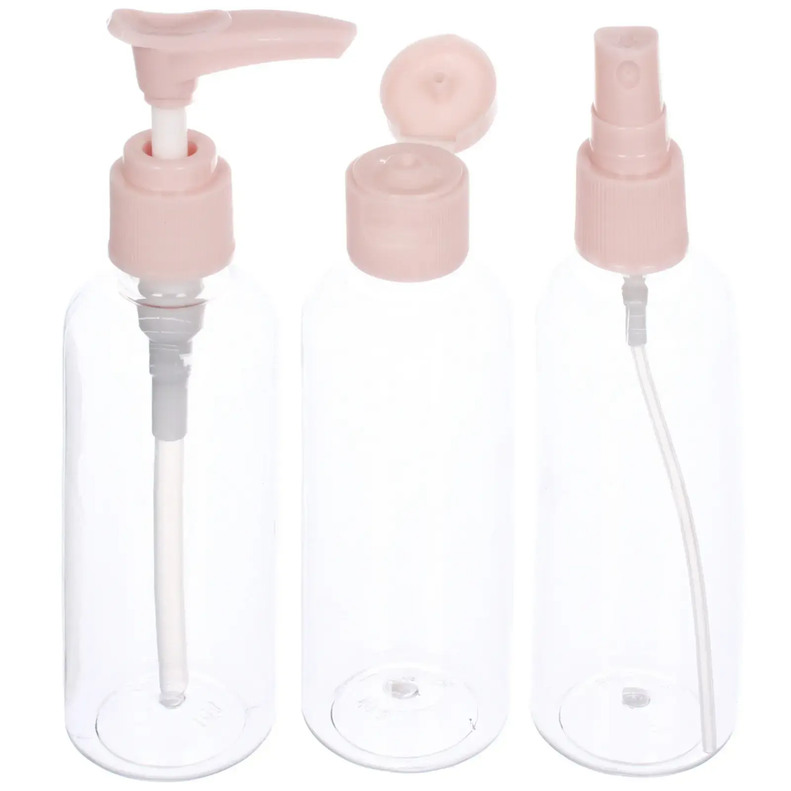В набор входят три флакона с различными типами крышек: помповый механизм, закручивающаяся крышка и распылитель. Это позволяет использовать флаконы для различных целей — от хранения шампуней и гелей до парфюмерии и средств для ухода за кожей. Прозрачный пластик позволяет видеть содержимое, а розовые крышки добавляют яркий акцент.
