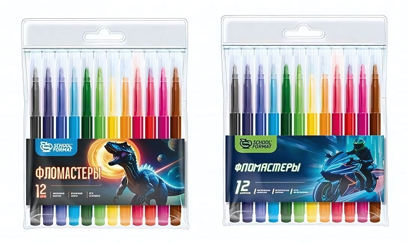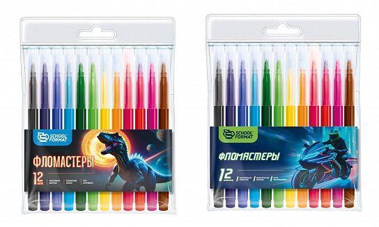 Фломастеры Schoolformat 12 цветов, круглый корпус, смываемые чернила, разноцветный принт