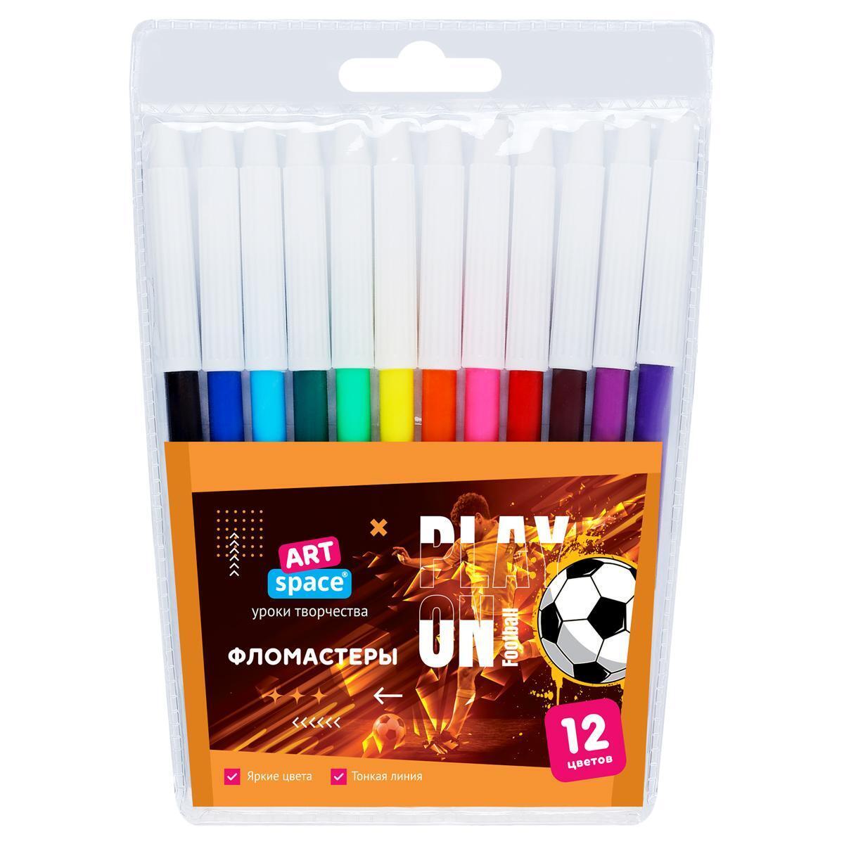 Фломастеры детские 12 цветов, нетоксичные, тонкий стержень, футбольный дизайн, ПВХ (Спейс)