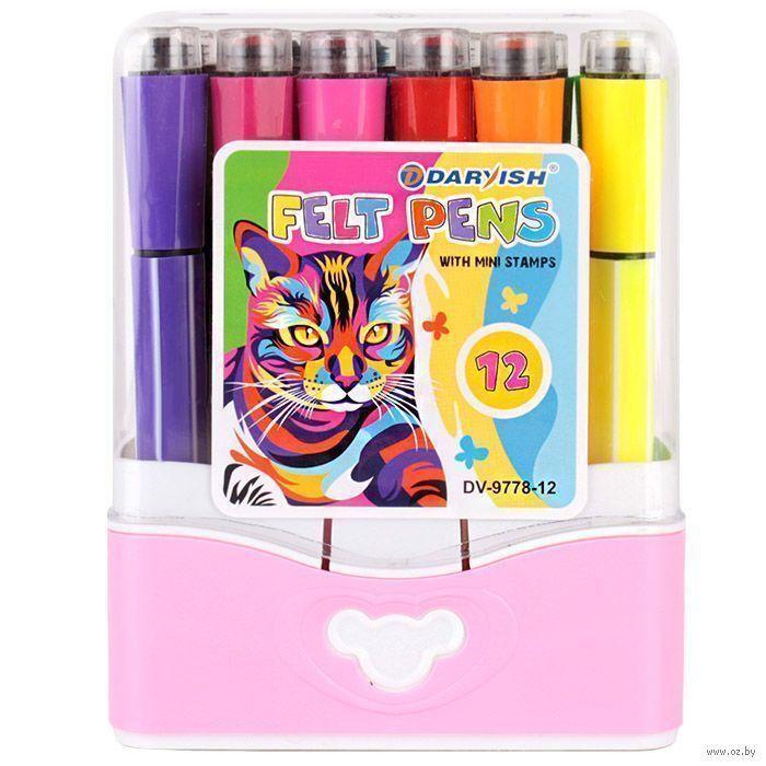 Фломастеры 12 цветов со штампиками «DV-9778-12», водная основа, розовый футляр 9×11,5×3,5см