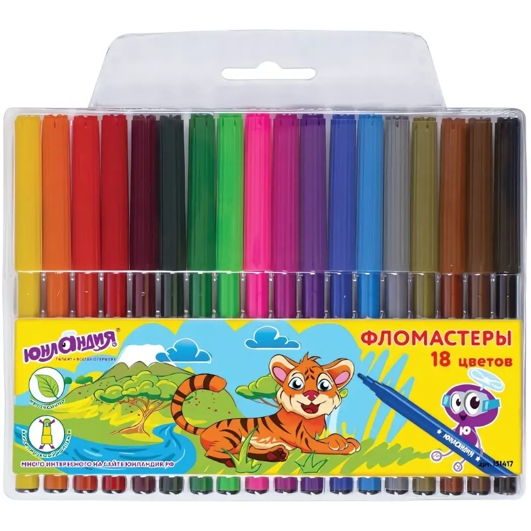 Каждый фломастер имеет гладкую текстуру и доступен в широком спектре цветов, включая красный, оранжевый, желтый, зеленый, черный, фиолетовый и многие другие. Упаковка прозрачная, что позволяет видеть все цвета, а также украшена изображением тигренка на фоне природы, что добавляет привлекательности. Фломастеры Юнландия — это не только качественный, но и безопасный выбор для вашего ребенка.