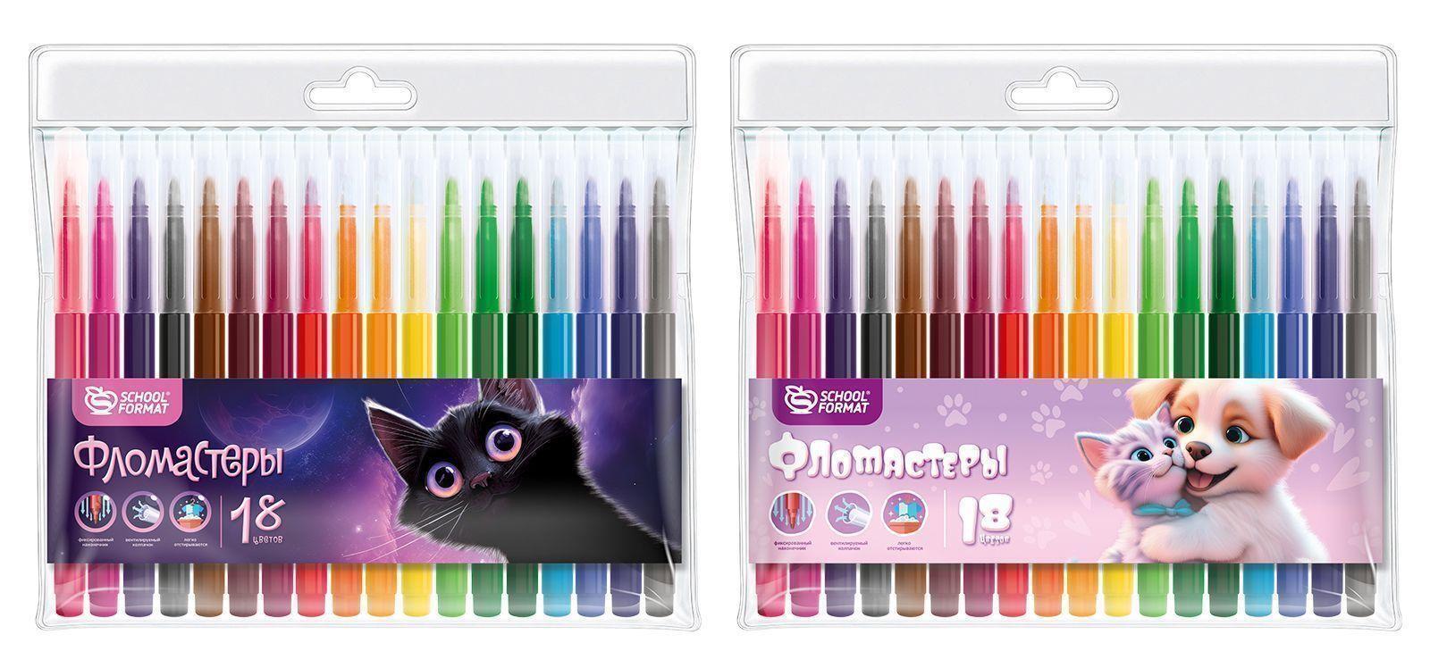 Удобный пластиковый блистер защищает фломастеры от повреждений и позволяет видеть все 18 цветов. Дизайн упаковки представлен в двух вариантах: с изображением милых животных или космической тематики (цвет в ассортименте).