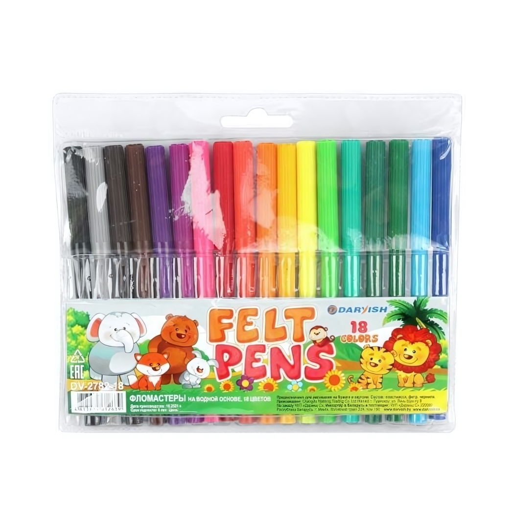 Размер упаковки составляет 18,5 см x 15 см x 1 см, что делает фломастеры компактными и удобными для хранения. В набор входят 18 различных цветов, включая черный, коричневый, фиолетовый, розовый, красный, оранжевый, желтый, зеленый и голубой. Эти фломастеры станут отличным подарком для творческих людей и помогут развить художественные навыки у детей.