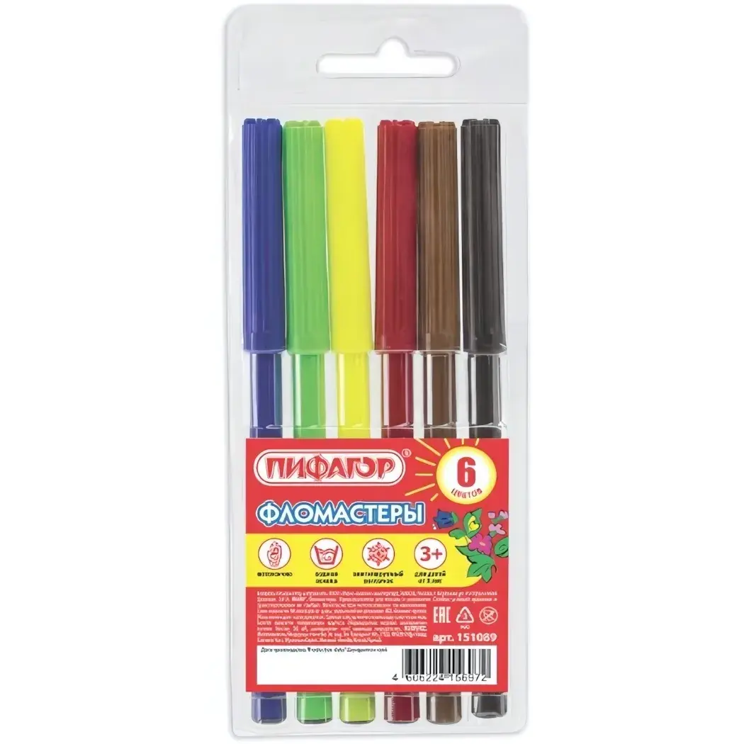 Фломастеры "Пифагор" 6 цветов, вентилируемый колпачок, безопасные для детей
