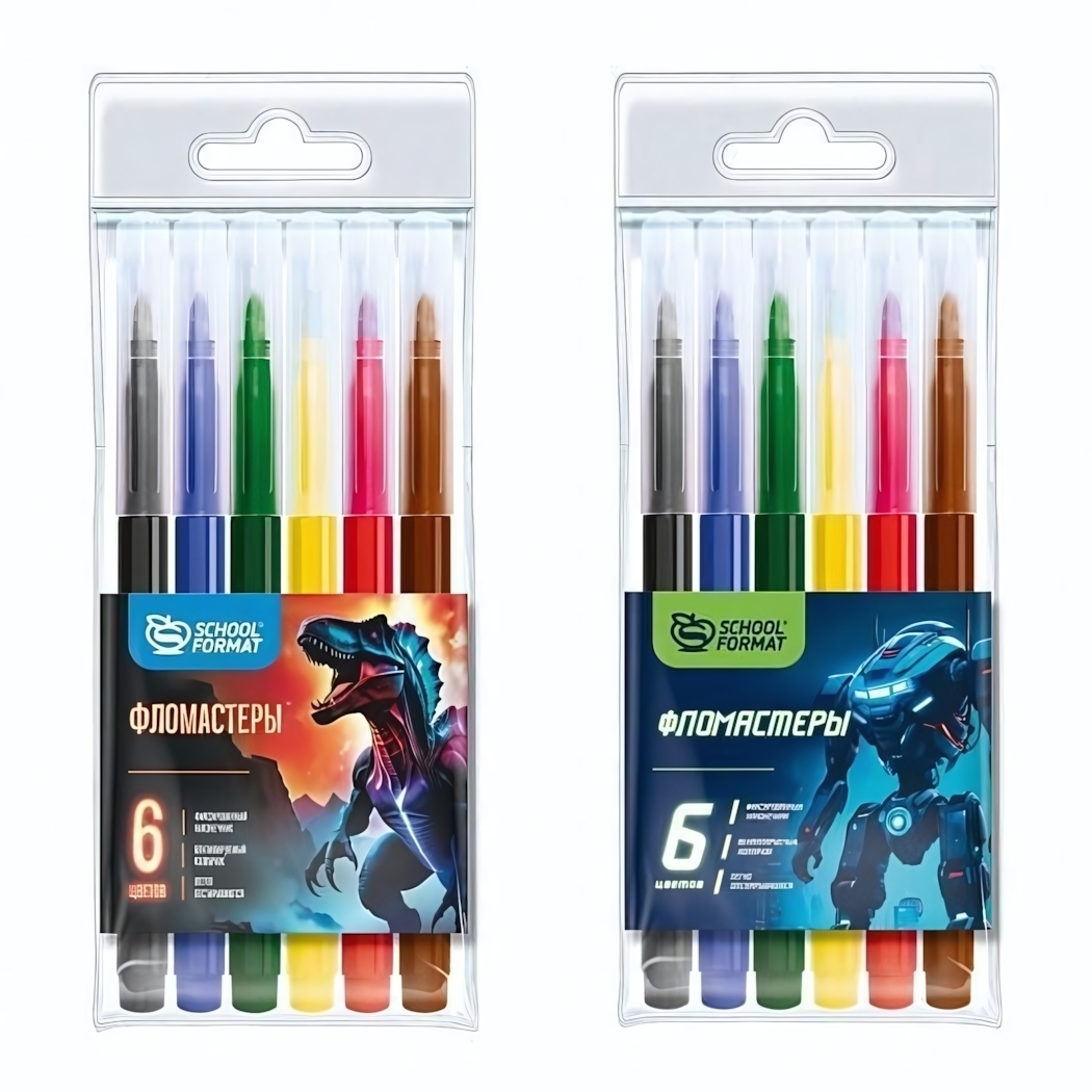 Фломастеры поставляются в прочной блистерной упаковке с красочным дизайном: динозавры или роботы - 'Микс для мальчиков'. Упаковка позволяет видеть все цвета набора перед покупкой.