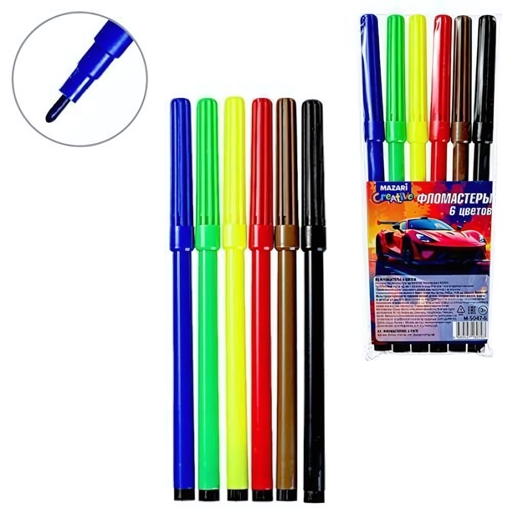 Фломастеры изготовлены из нетоксичного ПВХ с усиленным наконечником, который не деформируется при нажатии. Европодвесная упаковка позволяет разместить товар на крючке в магазине или дома — всегда под рукой в детской зоне творчества.