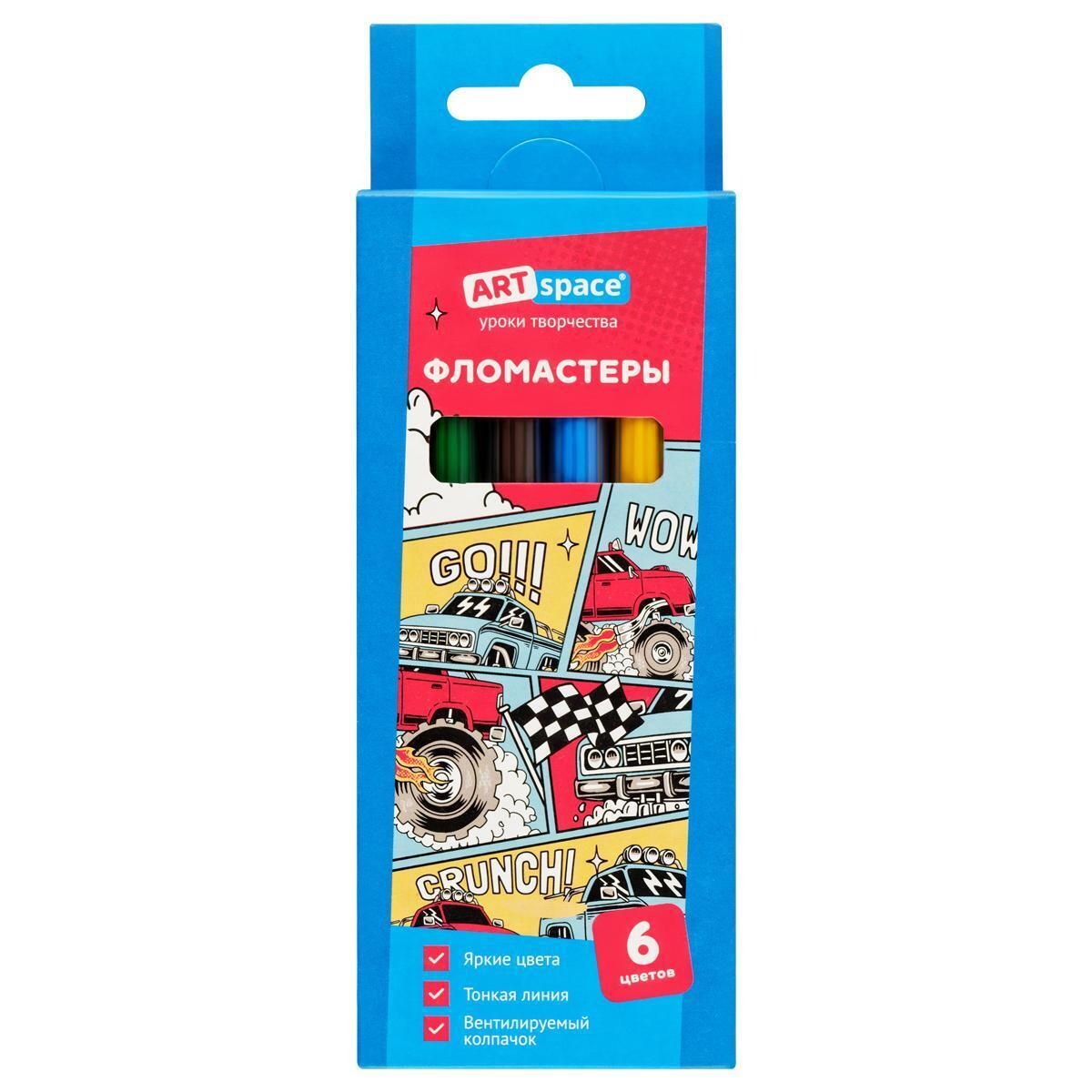 В упаковке содержится 6 фломастеров различных цветов, которые видны через прозрачное окошко. Упаковка выполнена в ярком синем цвете с изображением машин и комиксовыми надписями, что делает ее привлекательной для детей. Размеры фломастеров идеально подходят для детских рук, а их качество гарантирует долговечность и надежность в использовании.