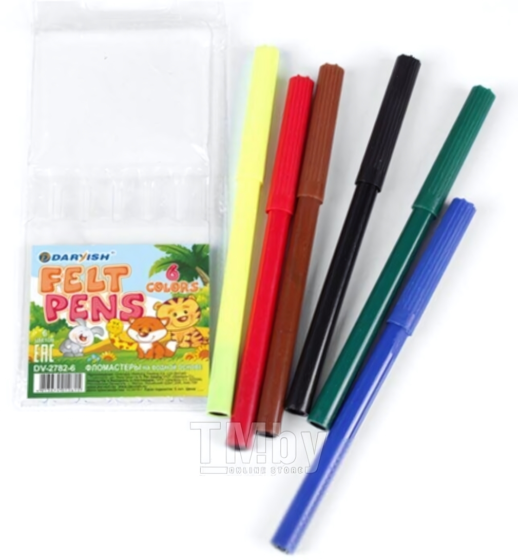 Фломастеры предназначены для рисования на бумаге и других поверхностях. Они легко наносятся и быстро сохнут, что позволяет создавать четкие и яркие линии. Набор включает шесть различных цветов: желтый, красный, коричневый, черный, зеленый и синий, что дает возможность экспериментировать с цветами и создавать уникальные сочетания.