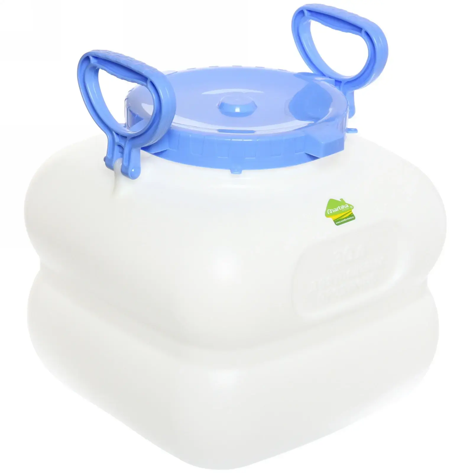 Форма контейнера — прямоугольная с округлыми краями, цвет — белый с голубыми ручками и крышкой. Надпись на корпусе подтверждает предназначение для питьевой воды и пищевых продуктов. Идеально подходит для дома, дачи, рыбалки и путешествий. Максимальный комфорт и уверенность в сохранности содержимого!