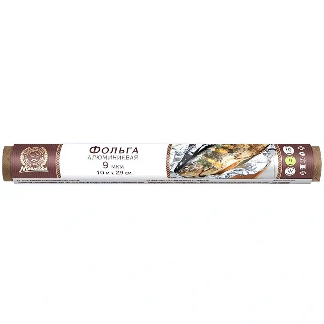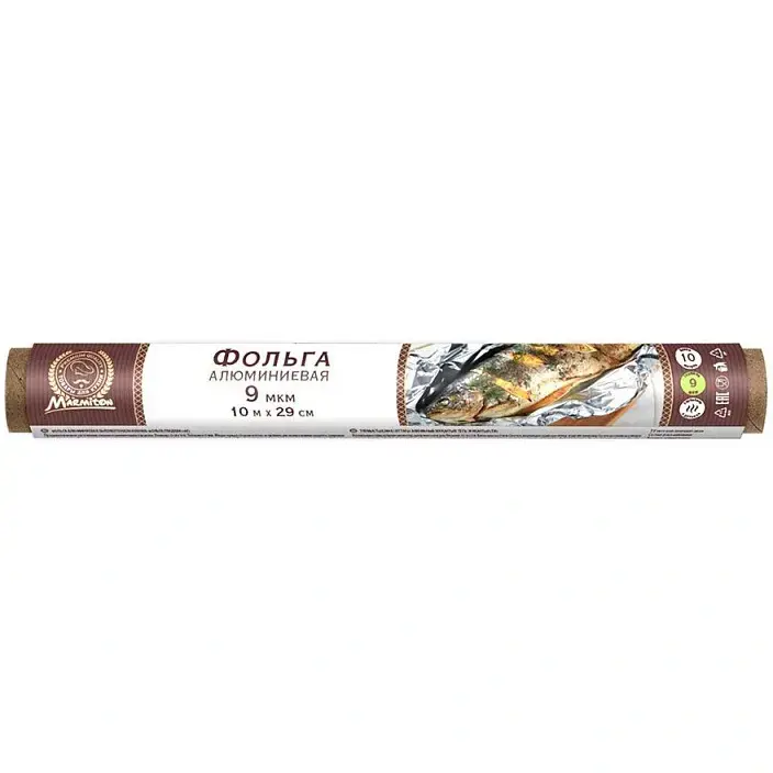 Фольга подходит для приготовления блюд в духовке, на гриле, а также для хранения и упаковки продуктов. Это универсальное решение для домашних кулинаров и тех, кто любит пикники или барбекю. Ширина полотна 29 см позволяет легко заворачивать крупные куски мяса или целые рыбы, а длина 10 метров хватает на множество кулинарных экспериментов.