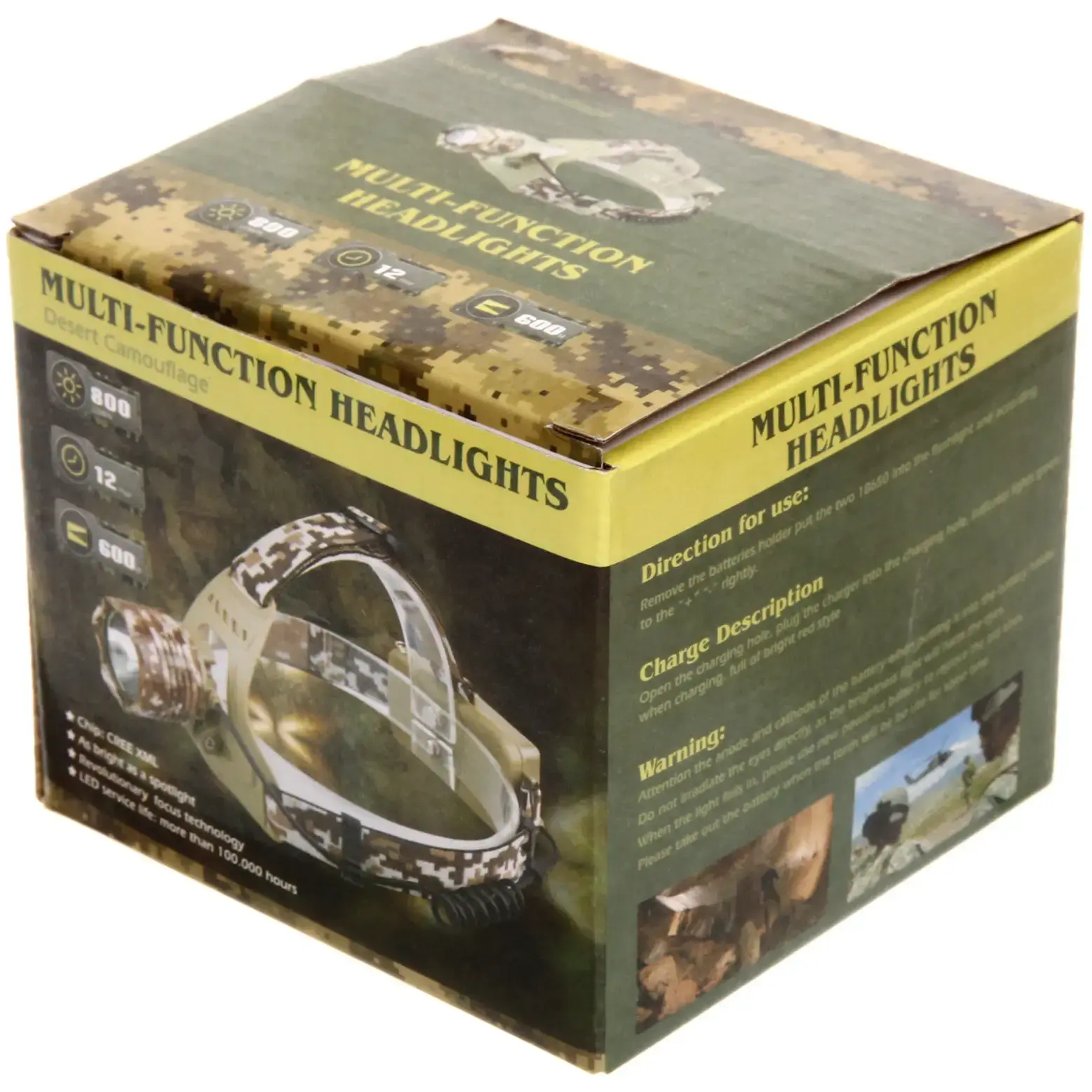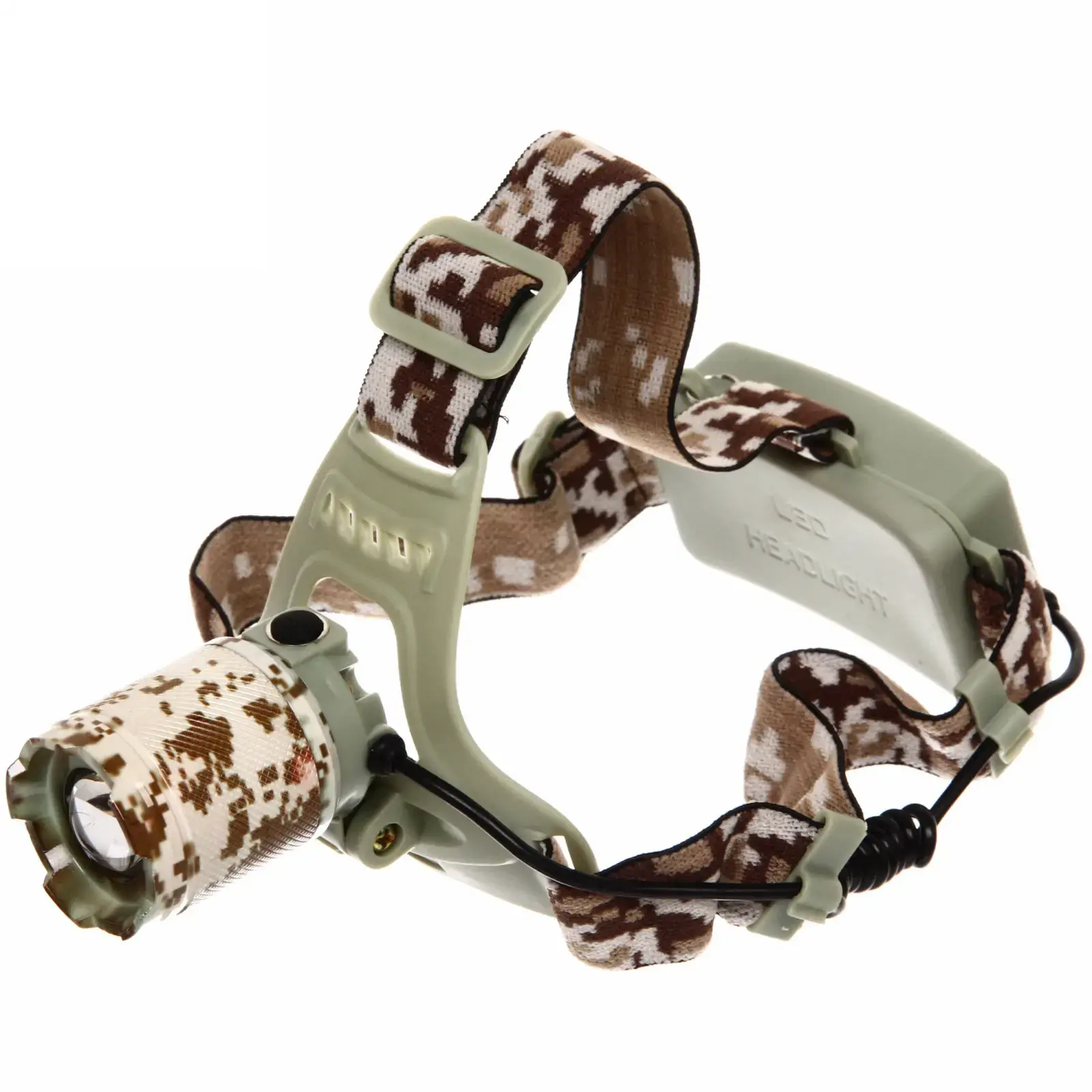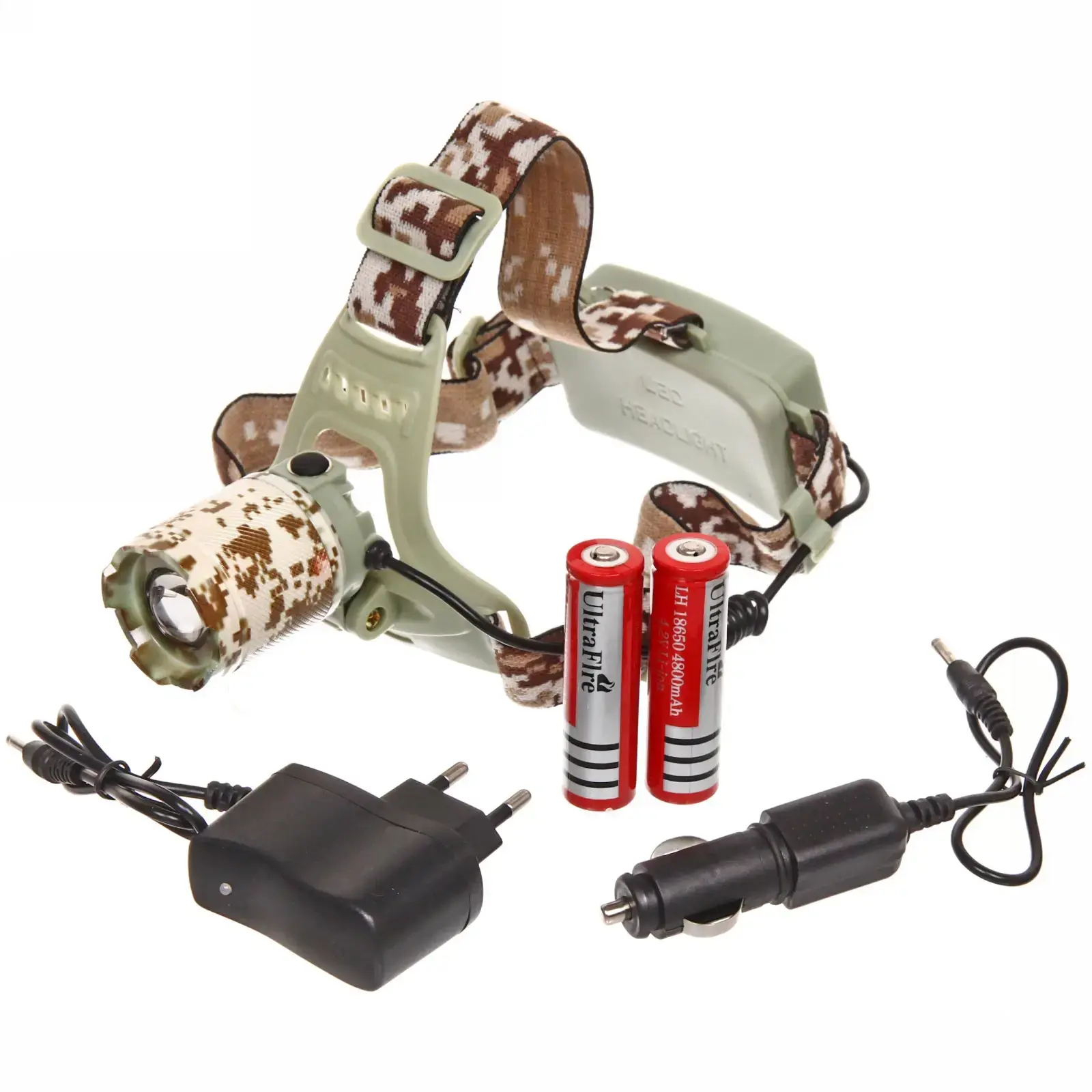 Фонарь оснащен аккумуляторной батареей, что позволяет вам не беспокоиться о замене батареек. Он легко включается и выключается с помощью кнопки, расположенной на корпусе. Регулируемый текстильный ремешок с камуфляжным рисунком обеспечивает надежную фиксацию на голове, что делает его удобным для длительного использования.