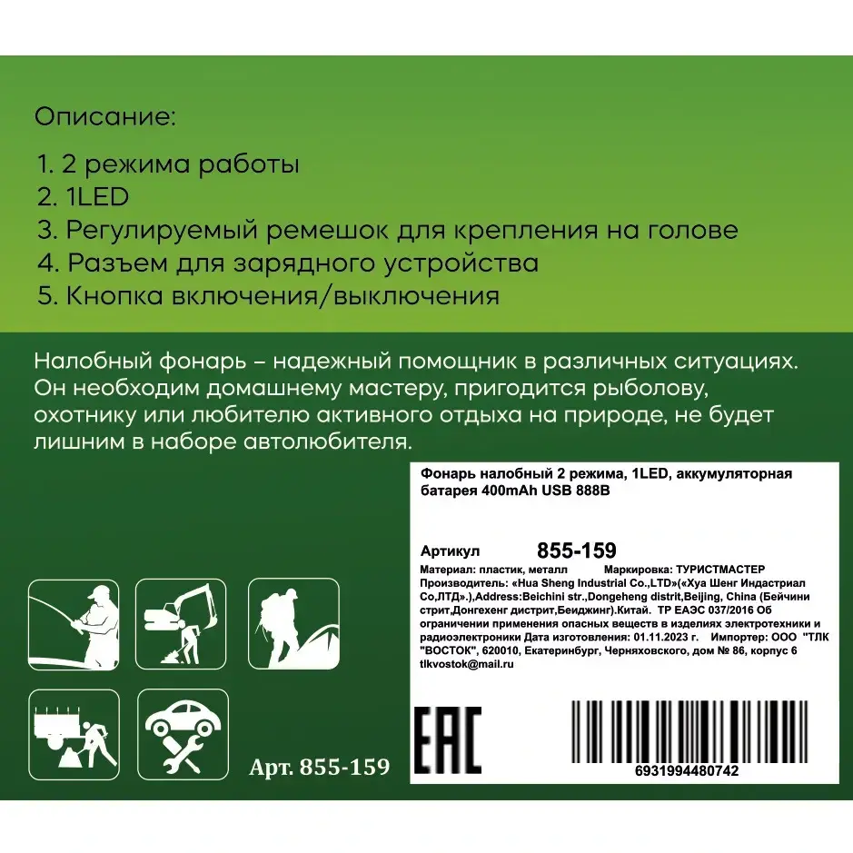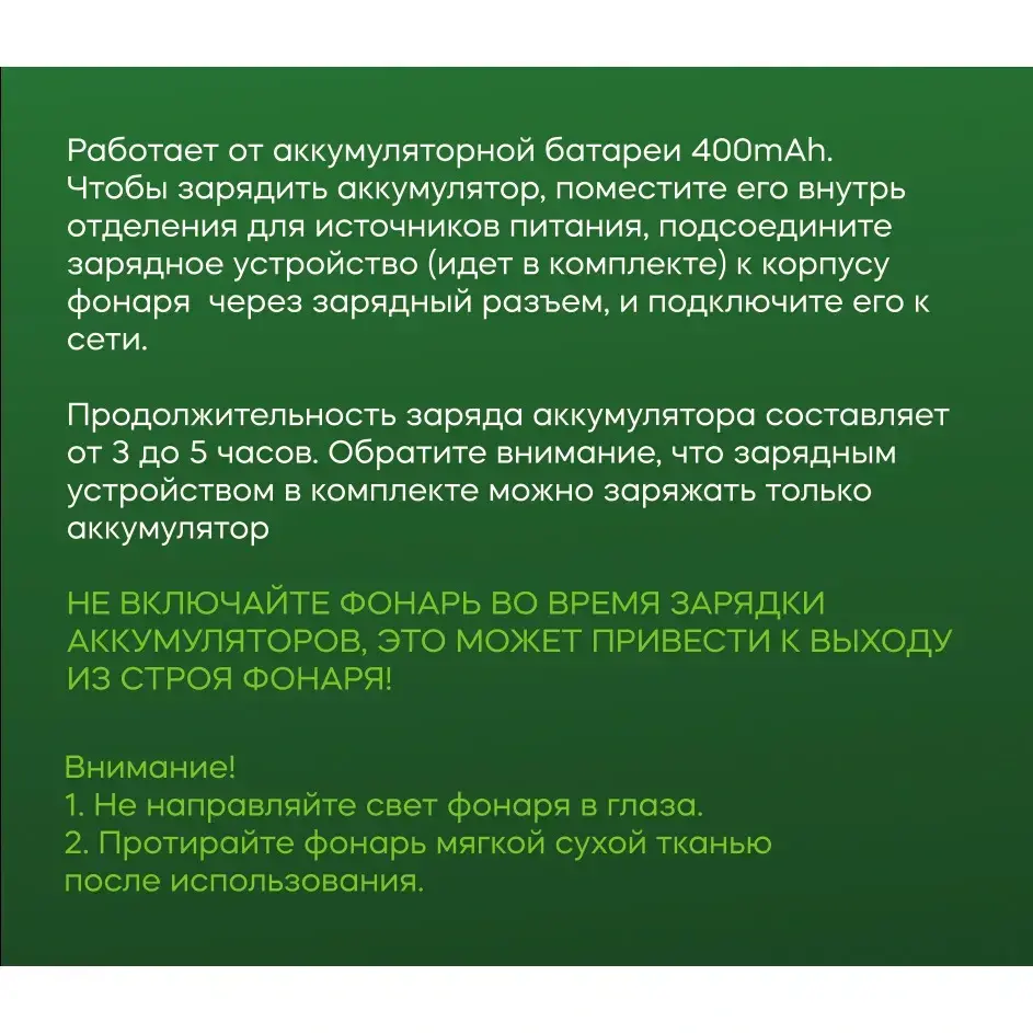 Фонарь имеет аккумулятор емкостью 400mAh, который обеспечивает длительное время работы. Время зарядки составляет от 3 до 5 часов. Угол наклона фонаря можно регулировать, что позволяет направить свет в нужную сторону. Этот фонарь станет незаменимым аксессуаром для всех, кто ценит комфорт и качество.