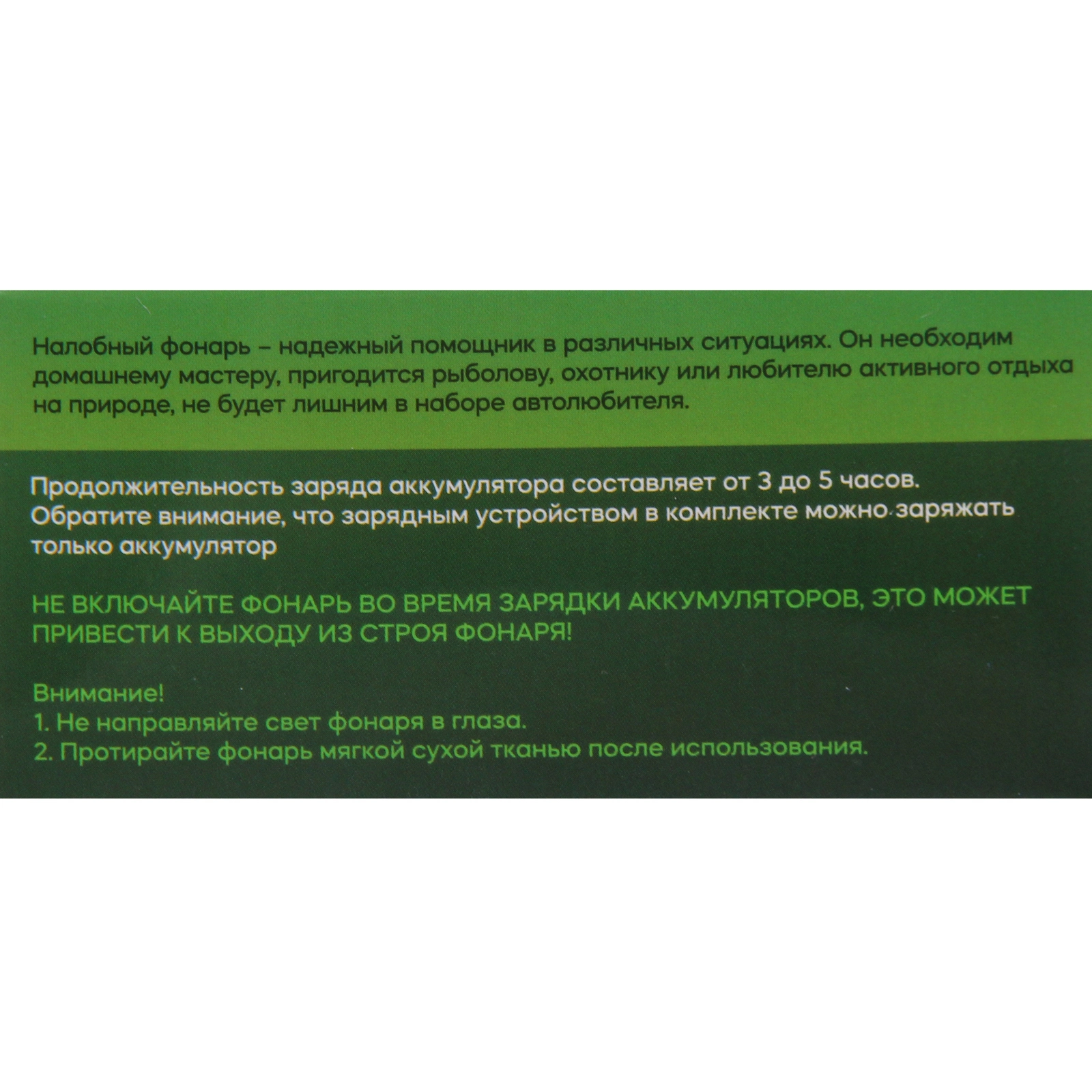 Не включайте фонарь во время зарядки аккумулятора — это может привести к выходу прибора из строя. Не направляйте луч света прямо в глаза. После использования протирайте корпус мягкой сухой тканью. Корпус фонаря изготовлен из пластика и металла, что обеспечивает лёгкий вес и достаточную прочность для повседневного использования.