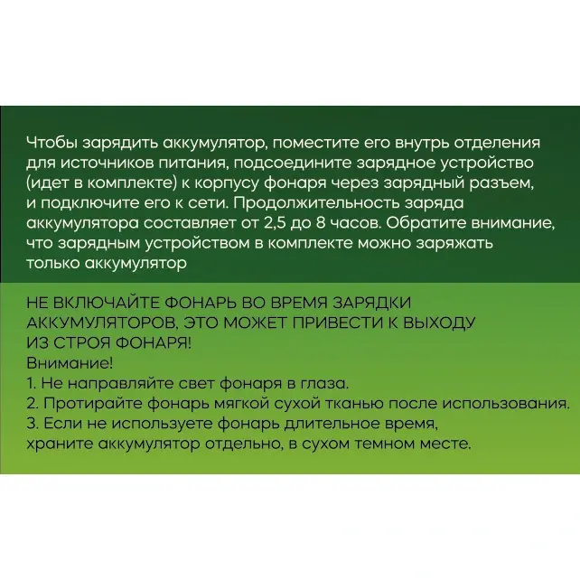 Среди основных преимуществ этого фонаря — высокая дальность свечения до 300 метров и водонепроницаемость с рейтингом IPX4, что позволяет использовать его в любых погодных условиях. Аккумуляторная батарея емкостью 400mAh заряжается через USB, что делает его удобным в использовании. Корпус фонаря выполнен из прочных материалов, что обеспечивает его долговечность и надежность.