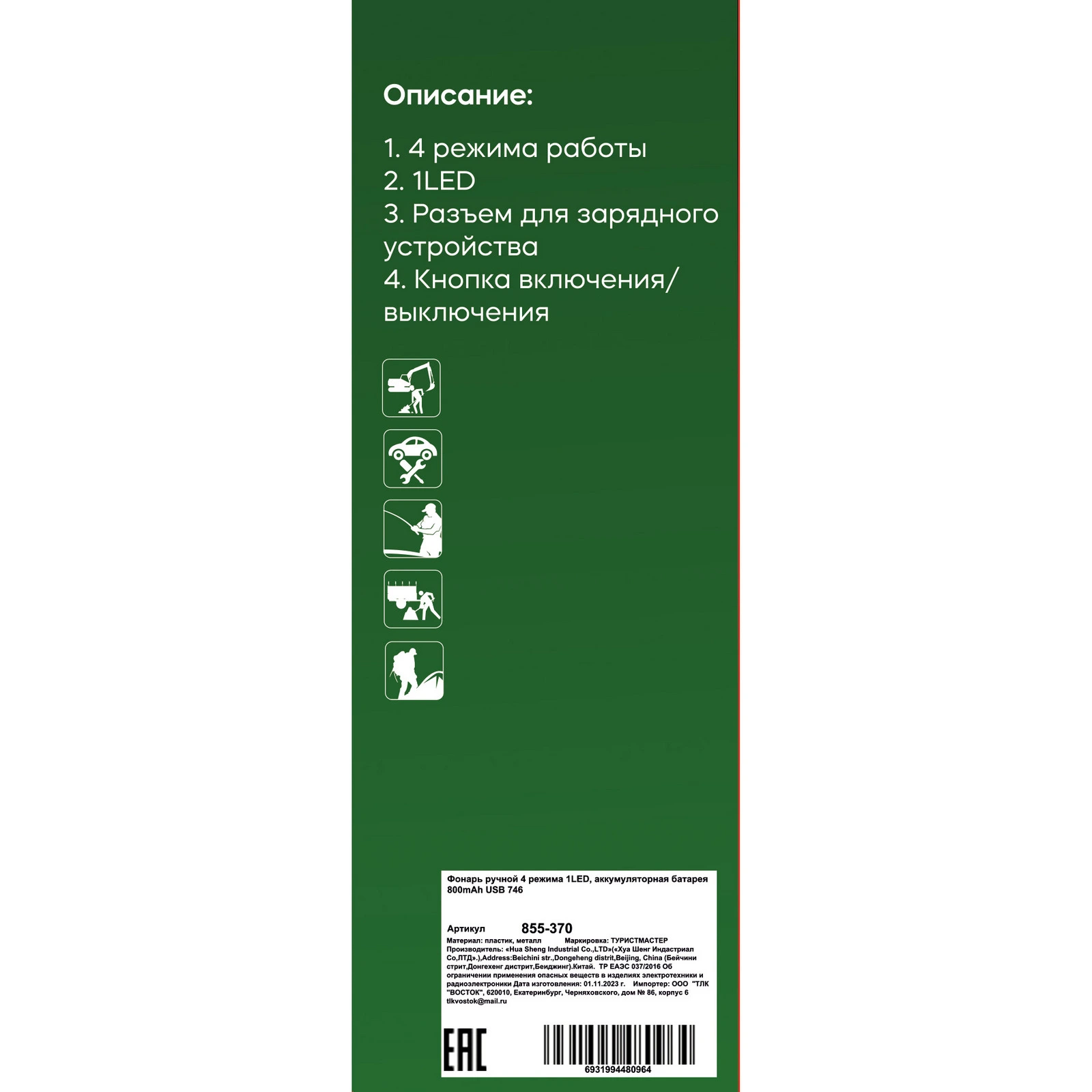 Этот компактный фонарь станет вашим надежным помощником в темное время суток. Он идеально подходит для использования в походах, на рыбалке или в домашних условиях. Благодаря аккумулятору емкостью 800mAh, фонарь обеспечивает длительное время работы и быстро заряжается через USB. Его стильный серебристый корпус с черными элементами не только привлекает внимание, но и обеспечивает удобство в использовании.