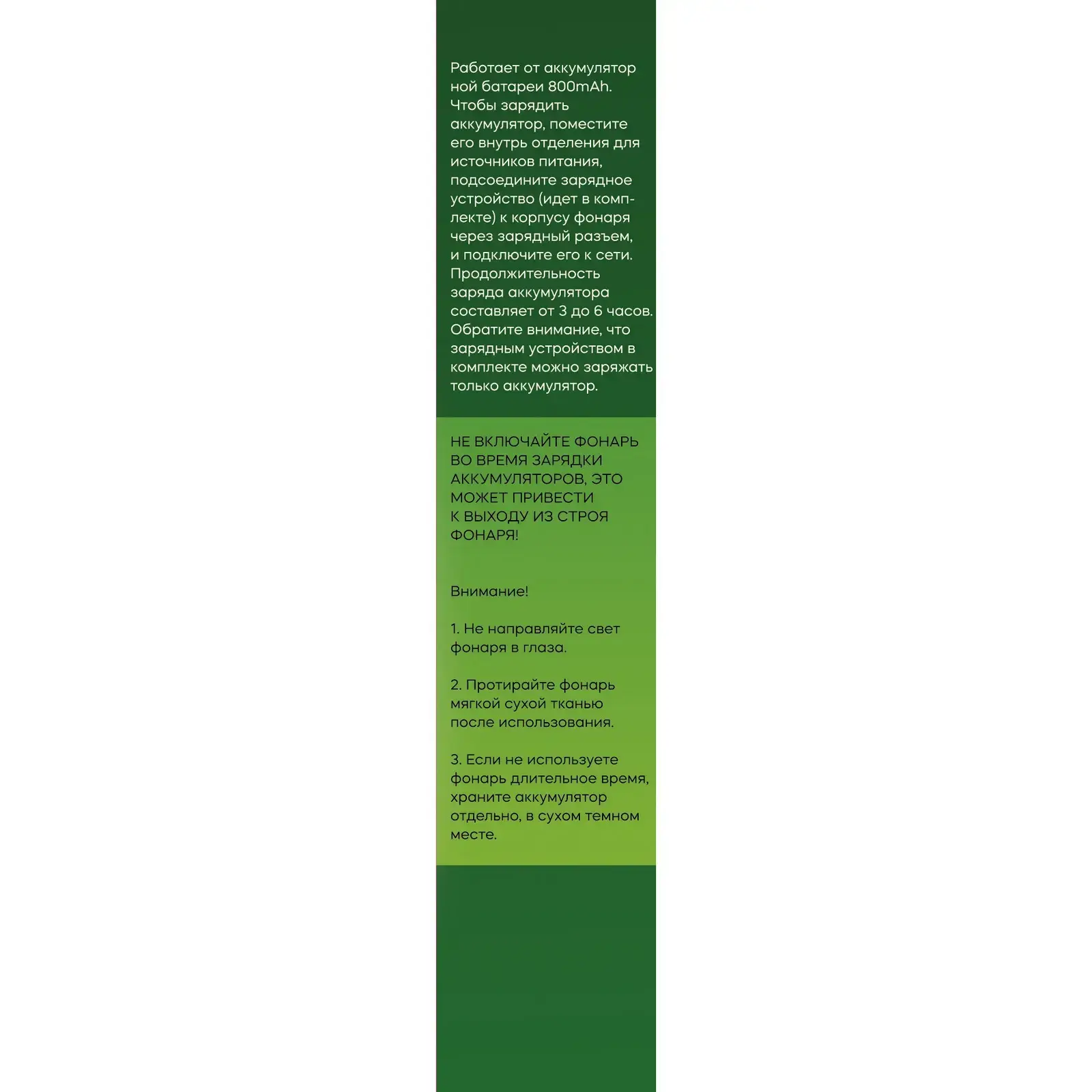 Фонарь оснащен 4 режимами работы, что позволяет выбрать оптимальный уровень яркости в зависимости от ваших нужд. Он идеально подходит для туристов, охотников и всех, кто ценит практичность и удобство. Благодаря встроенному аккумулятору емкостью 800mAh, фонарь можно легко зарядить через USB, что делает его использование еще более удобным.