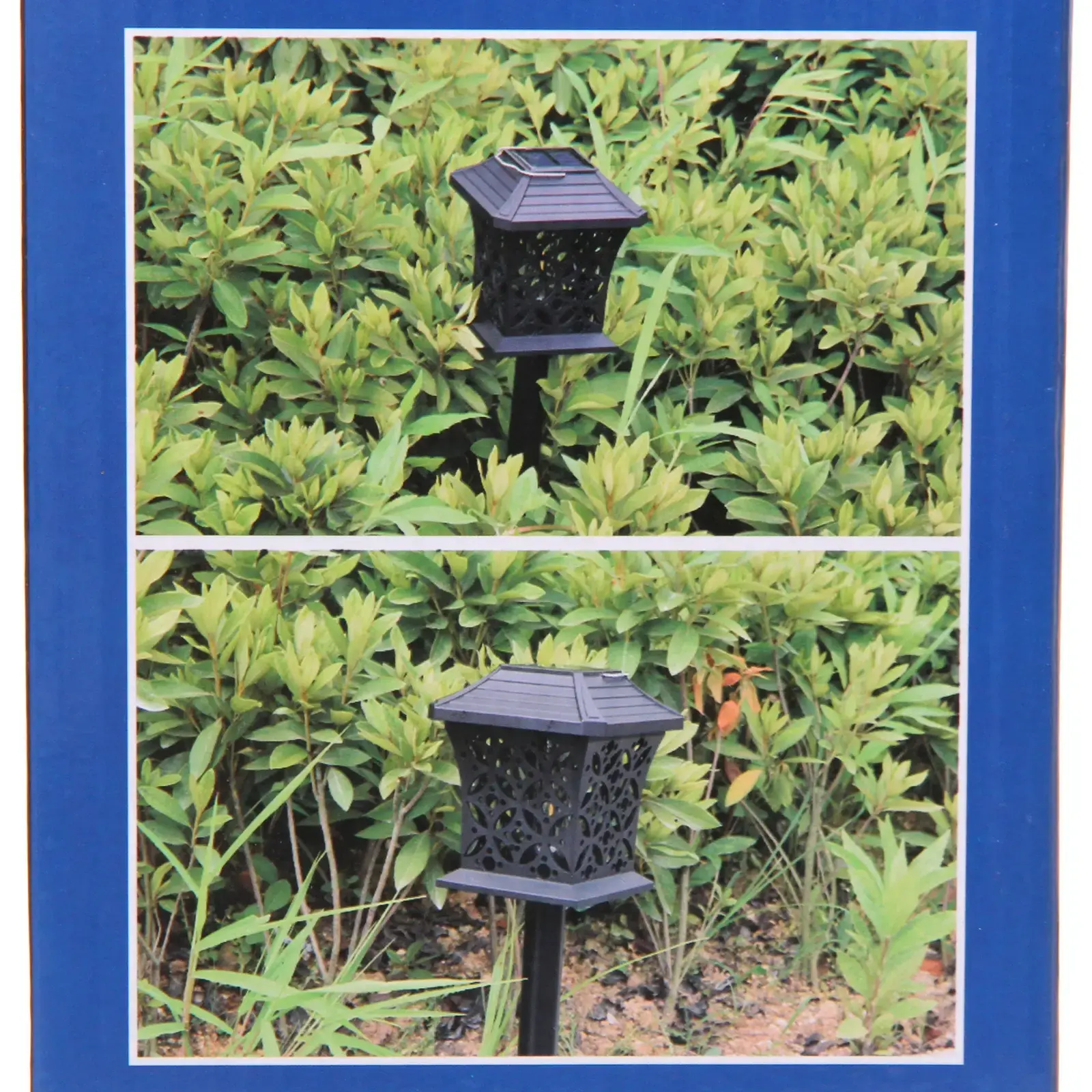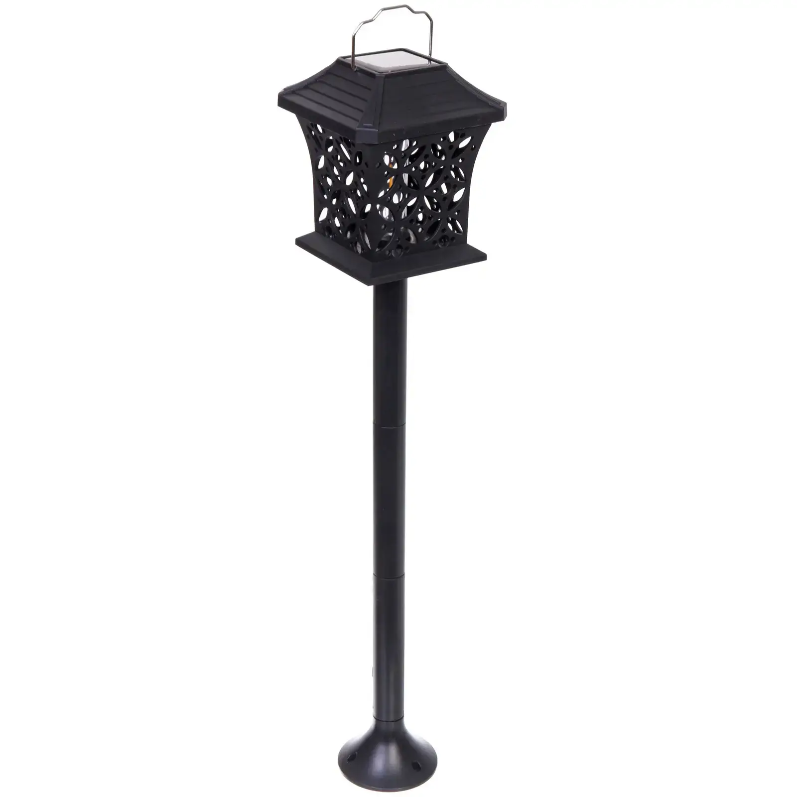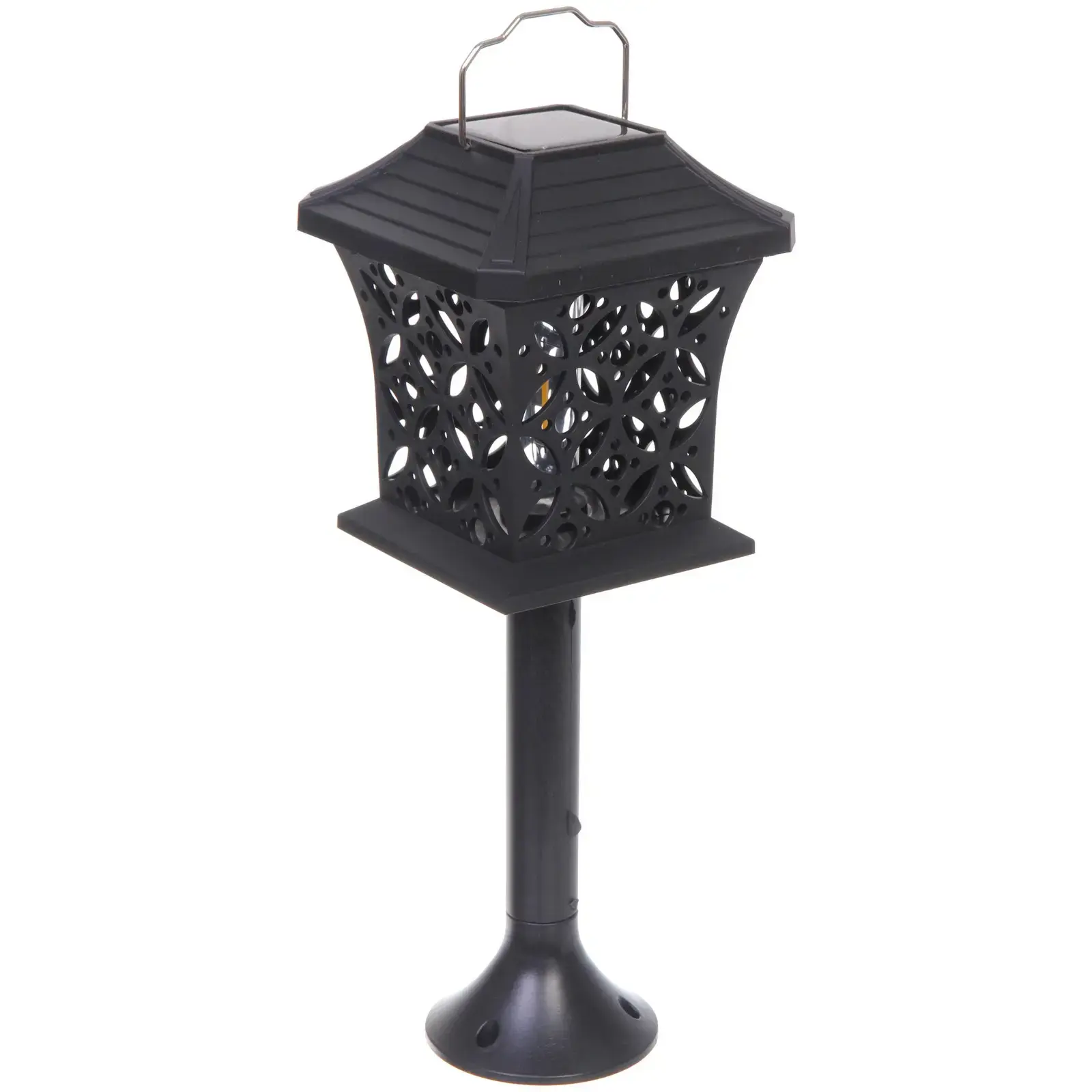 Фонарь выполнен из прочного пластика, что обеспечивает его долговечность и устойчивость к погодным условиям. Размеры фонаря составляют 12х12х13,5 см, а высота с учетом стойки достигает 60 см. Черный цвет делает его универсальным элементом декора, который впишется в любой ландшафтный дизайн.