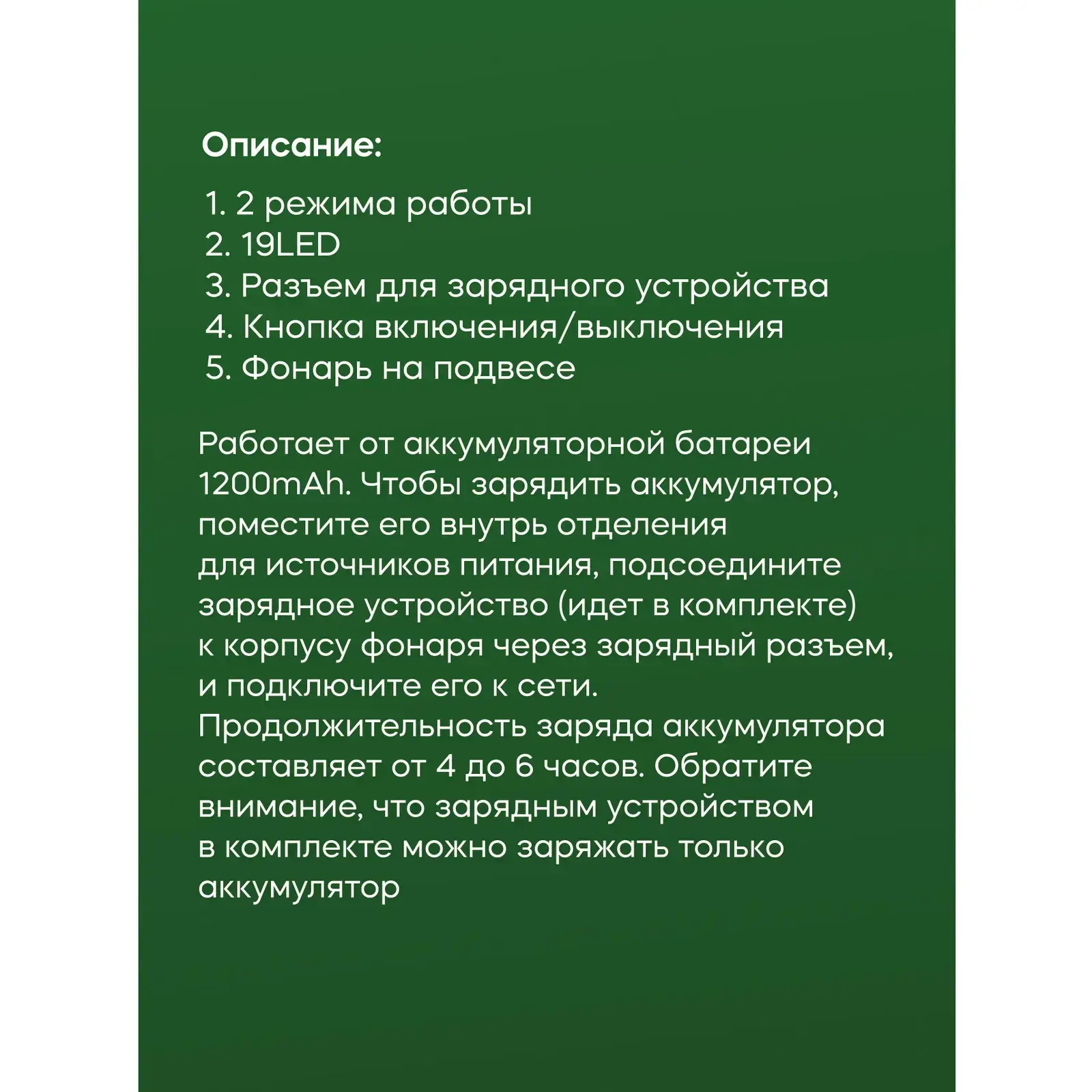 Ищете надежный источник света для активного отдыха? Наш туристический подвесной фонарь с 19 светодиодами и двумя режимами работы станет вашим незаменимым помощником в темное время суток. Он обеспечивает яркость до 200 лм, что гарантирует отличное освещение даже в самых сложных условиях. Благодаря встроенному аккумулятору емкостью 1200mAh, вы сможете использовать фонарь без привязки к электросети, что делает его идеальным для кемпинга, рыбалки или вечерних прогулок на природе.