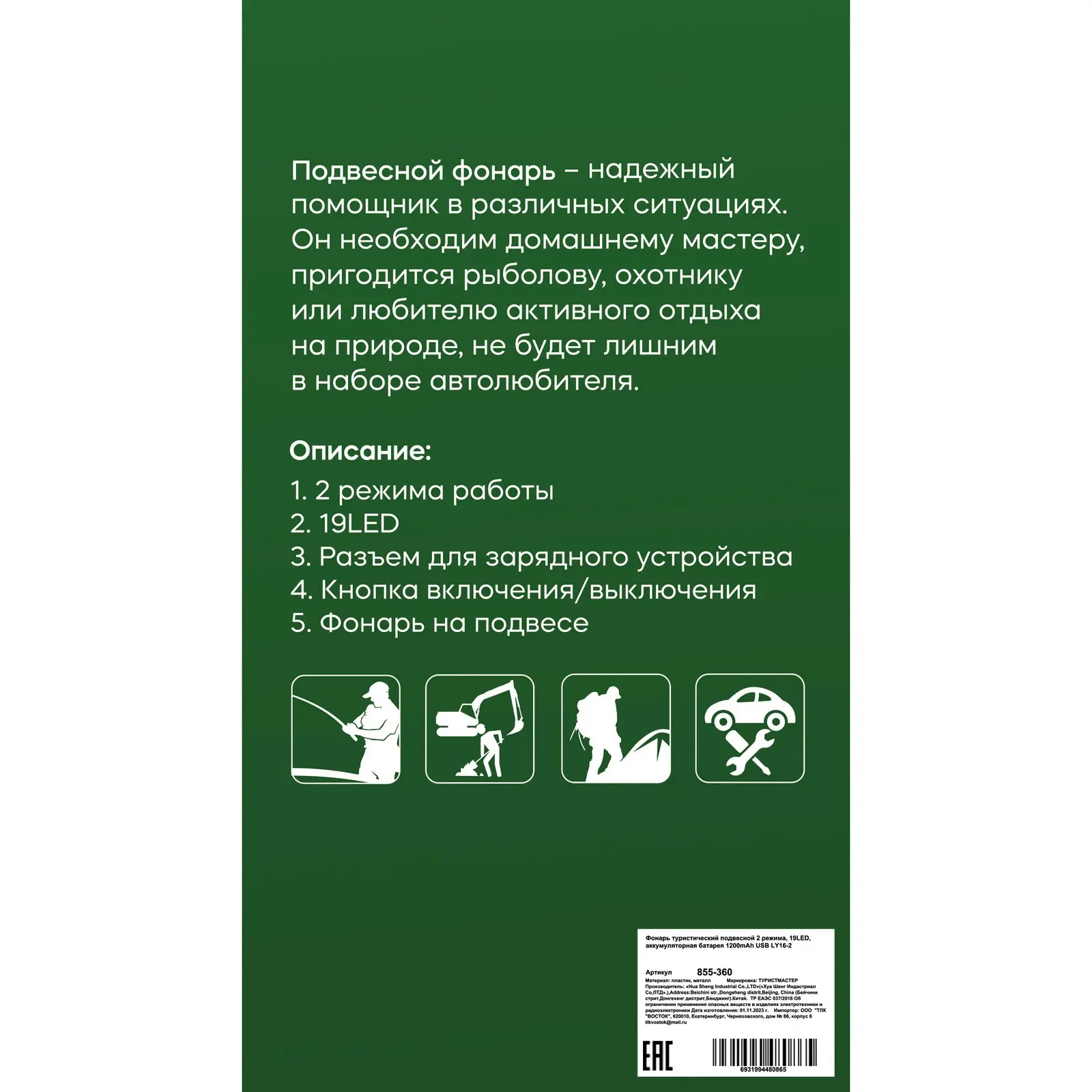 Этот туристический фонарь станет вашим незаменимым помощником в темное время суток. С его помощью вы сможете наслаждаться активным отдыхом на природе, не беспокоясь о недостатке света. Фонарь оснащен 19 светодиодами, которые обеспечивают яркость до 200 лм, что гарантирует отличное освещение даже в самых сложных условиях. Благодаря встроенному аккумулятору емкостью 1200mAh, вы сможете использовать фонарь без необходимости подключения к электросети, что делает его идеальным для кемпинга, рыбалки или охоты.
